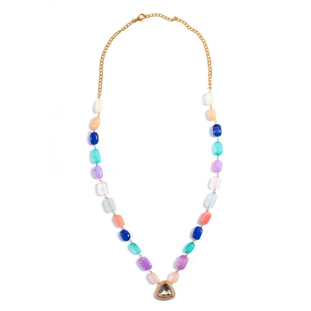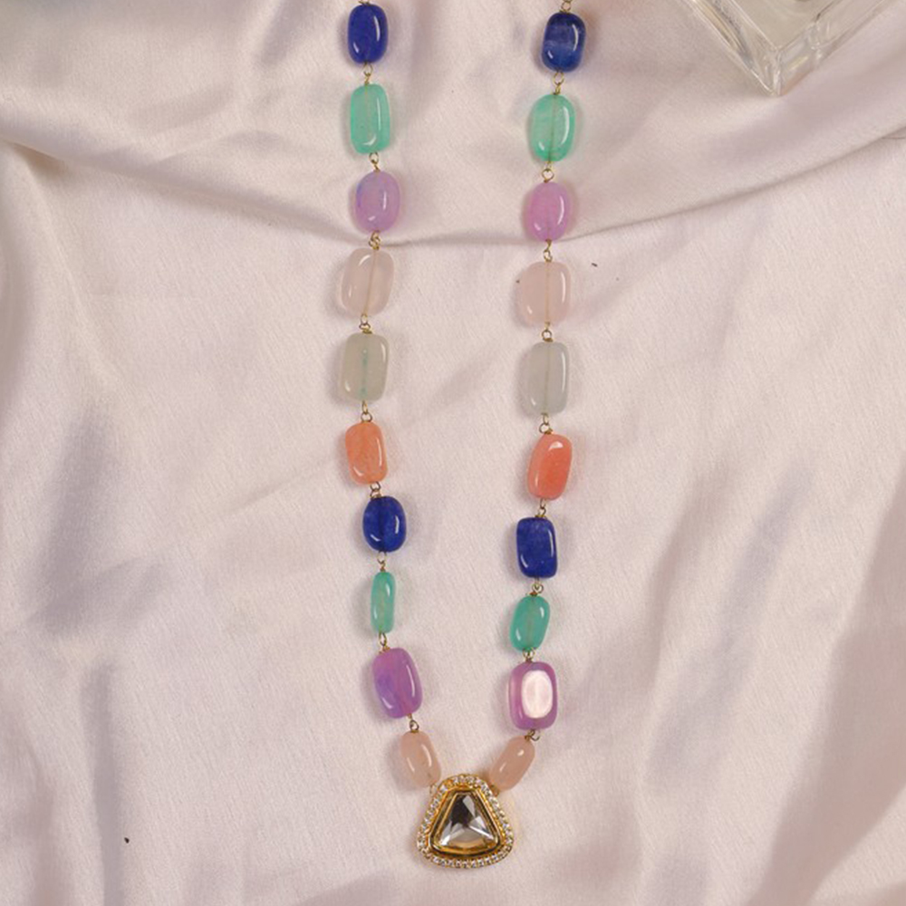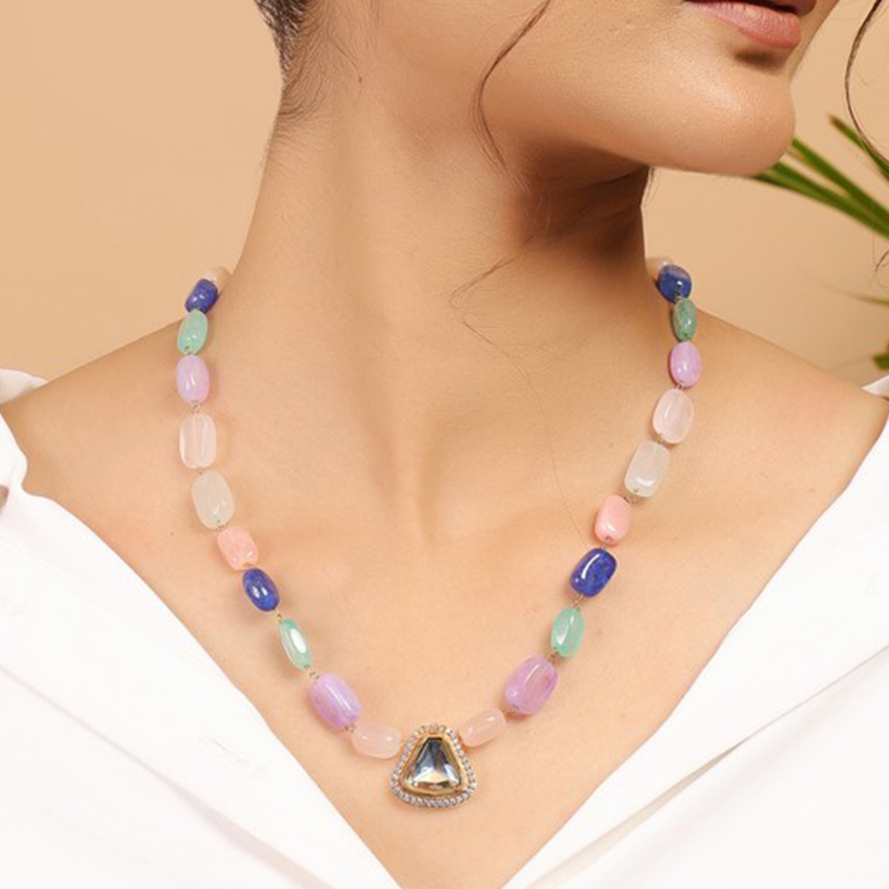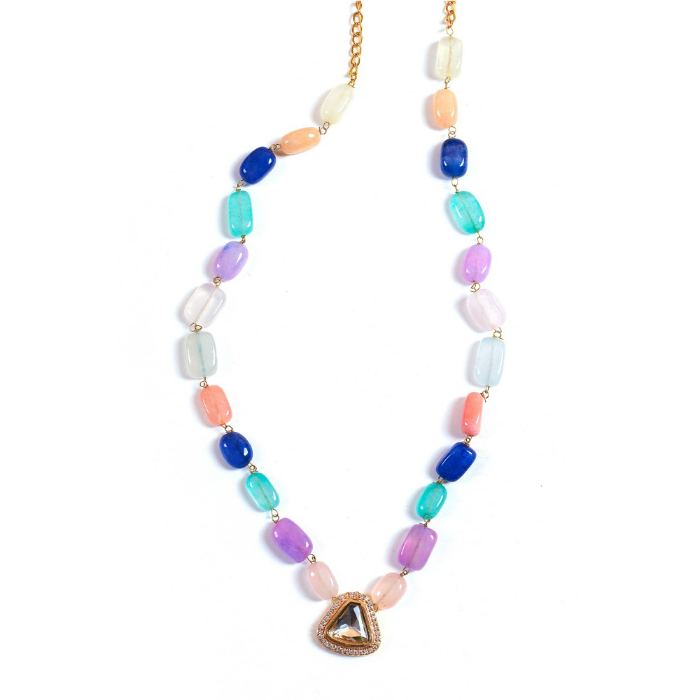 • Colorful Pastel Beaded Necklace with Triangular Kundan Pendant