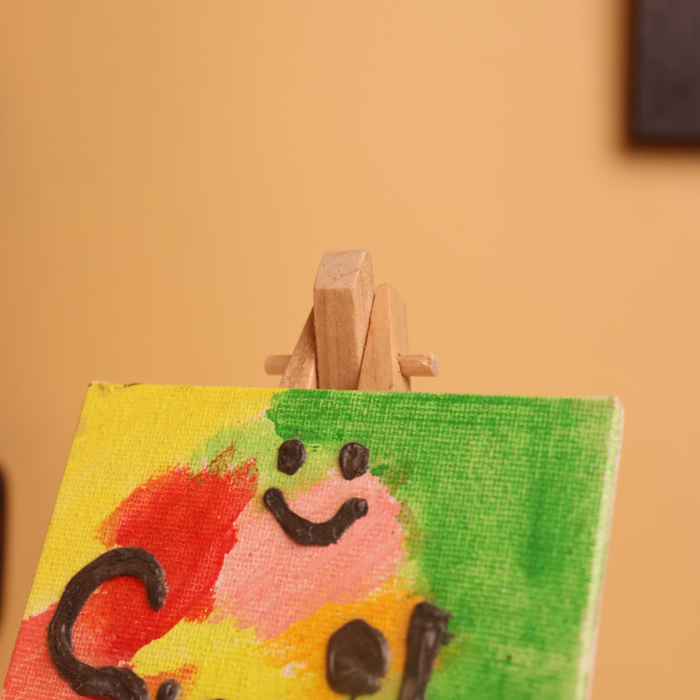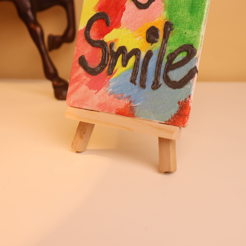Brighten your space and your mood with this vibrant 4x4 inch handcrafted canvas painting, featuring the uplifting word “Smile” in raised textured paint. Bursting with a cheerful palette of yellow, green, red, blue, and pink, the abstract background evokes joy and spontaneity. The word “Smile” is boldly written in thick, raised black paint for a tactile and eye-catching contrast. A cute little smiley face adds an extra dose of positivity, making this miniature artwork a perfect reminder to embrace happiness every day. Crafted with love and acrylic texture mediums, the canvas is mounted on a mini wooden easel, ready to be displayed on your desk, shelf, or bedside table. Ideal as a thoughtful gift, daily affirmation piece, or fun accent to any décor, this artwork blends playful design with handmade charm. Each piece is uniquely created, making it a one-of-a-kind keepsake that spreads joy wherever it’s placed.