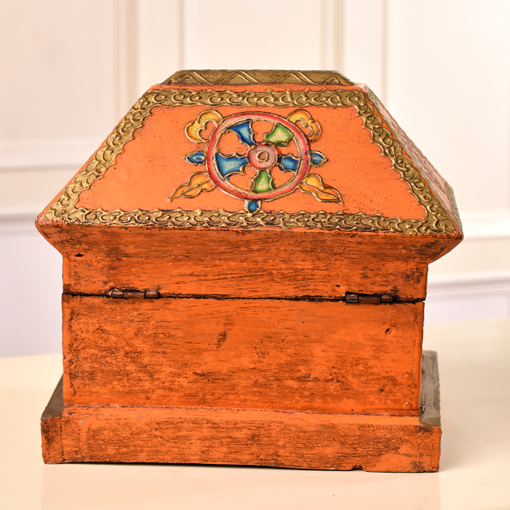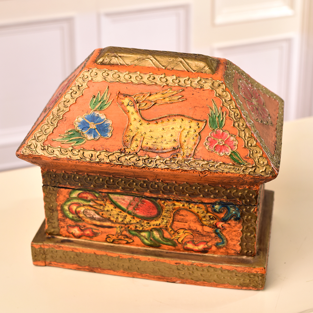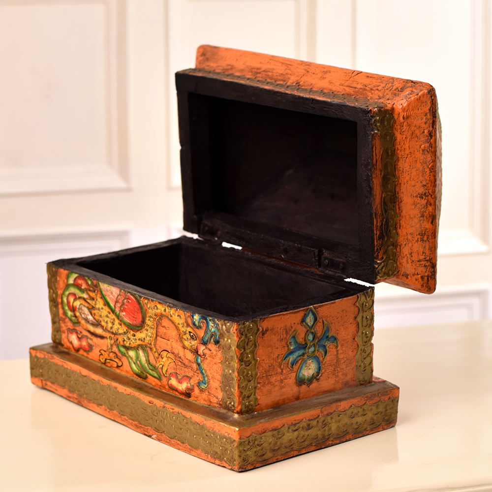 Indulge in the enchanting allure of this exquisitely crafted wooden box that is a testament to the artistry of professional Indian artisans. Meticulously handmade from high-quality wood, this box is a fusion of tradition and craftsmanship. Adorned with captivating engravings of majestic dragons, whimsical animals, and delicate floral motifs, each detail tells a story of cultural richness. What sets this box apart is its vibrant, multi-coloured palette, adding a burst of joy to its intricate design. Versatile and practical, it serves as an ideal jewelry box, preserving your precious treasures with style. Its compact size makes it perfect for storing other small items, maintaining both functionality and elegance. Elevate your space by displaying this masterpiece at exhibitions, where its beauty can be admired by connoisseurs and enthusiasts alike. As a thoughtful gift, this handmade marvel becomes a symbol of affection on special or festive occasions, a tangible expression of love for your cherished ones.