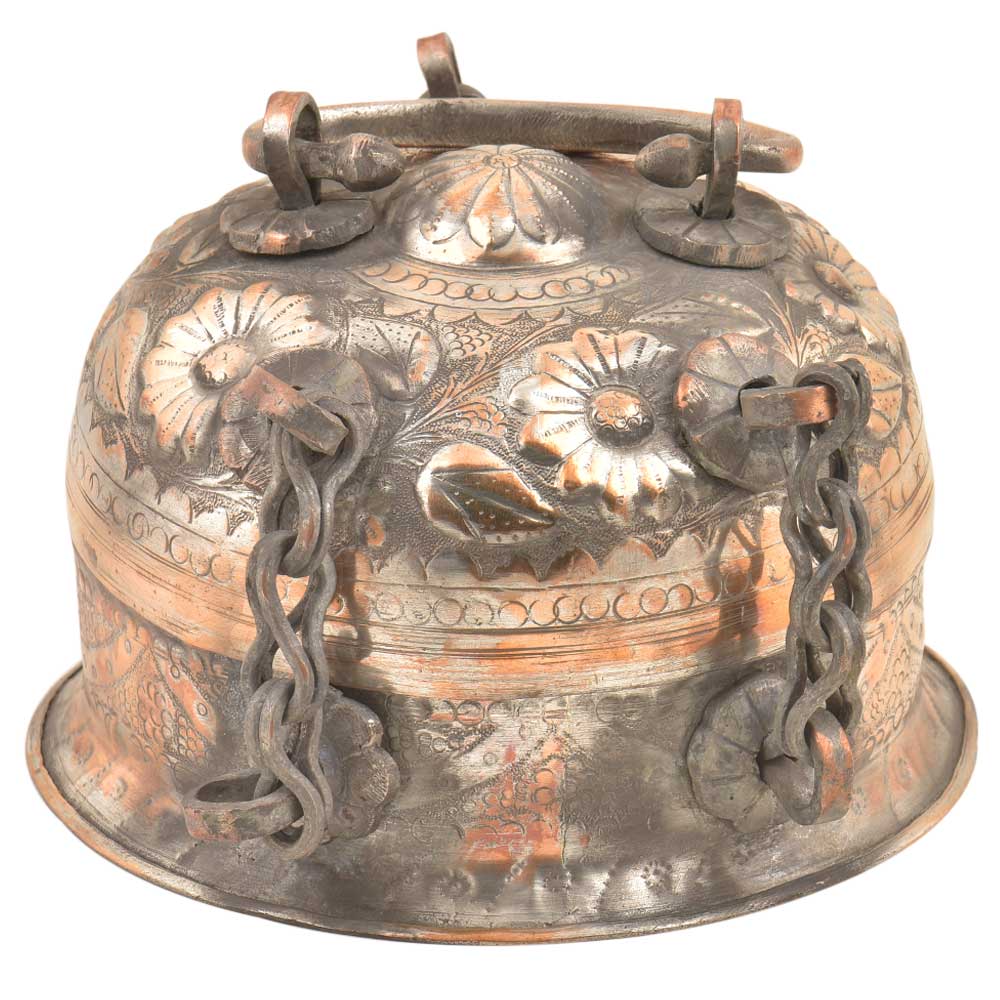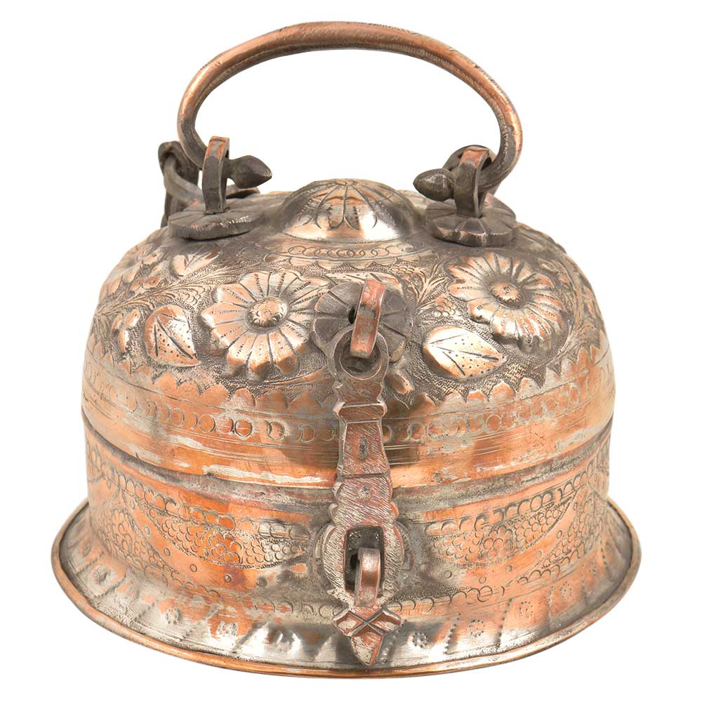 A lovely Big Size Betel or Pandan Box with intricate work done on it . The Box contains a tray, three larger covered round containers, one smaller covered round container, two bowls with stands and two small plates. The copper is finely hammered in a detailed floral and vine pattern all throughout the pieces with the exception of the stands and two small plates. It is can also be used as a home décor piece and gift for relatives and friends. Used for storing betel leaf, betel nut, dry tobacco, lime, catchu, and saffron.