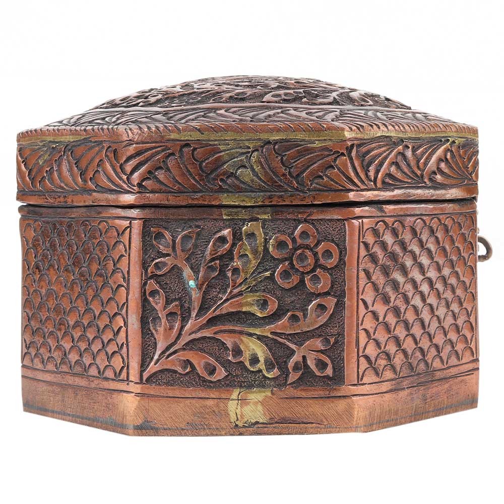 This lovely eight sided shaped box appears to be made of copper. It has a beautiful embossed pattern on the entire surface of the box .It has a hinged lid and a latched closure. Store your valuables, jewelery and important documents in this box. It is an ideal gifting option for friends and relatives.