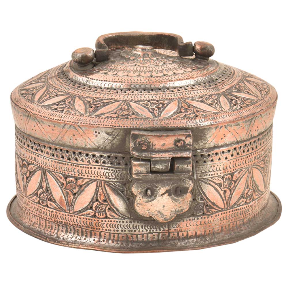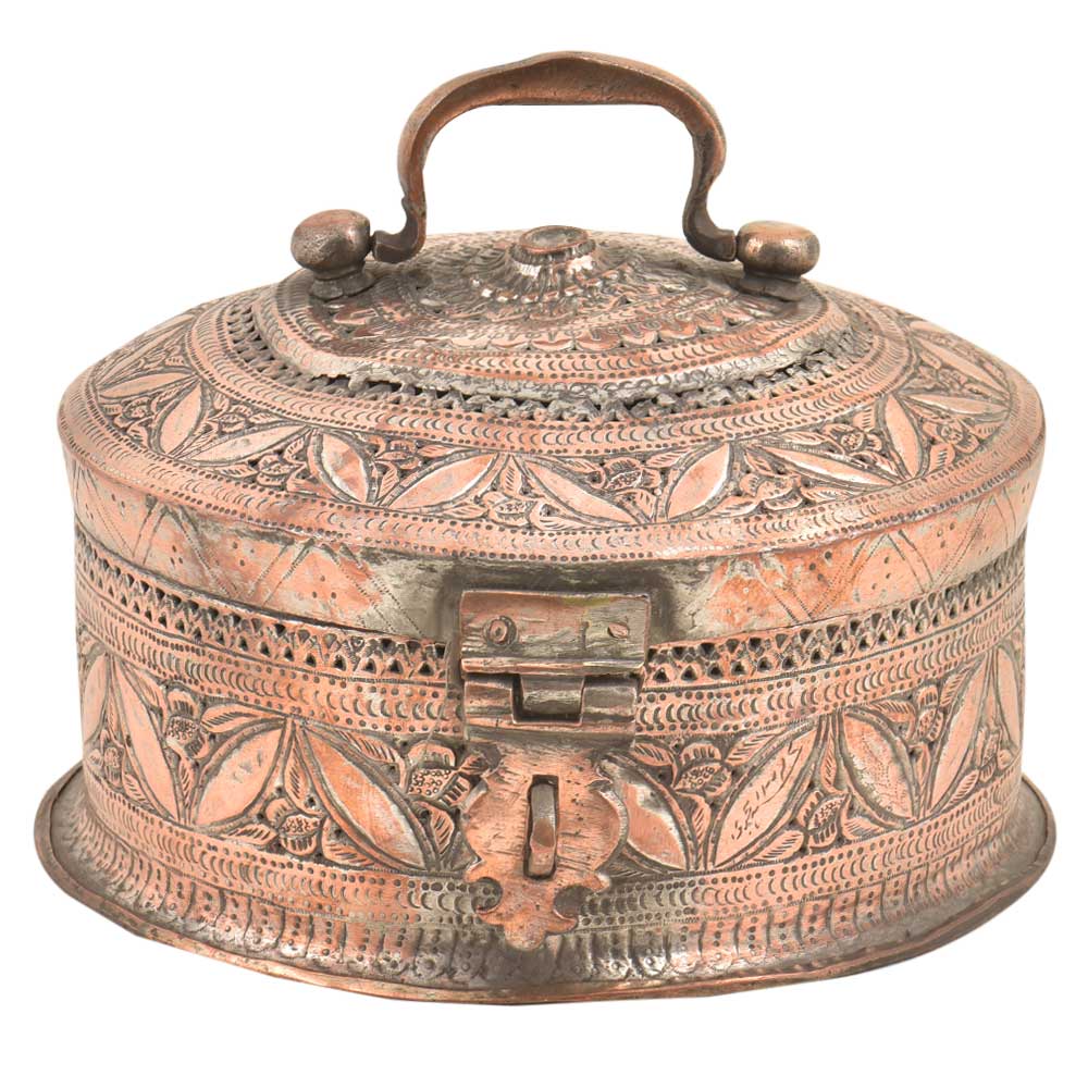 Copper Engraved Leaves Round Beetal Nut Box with Handle