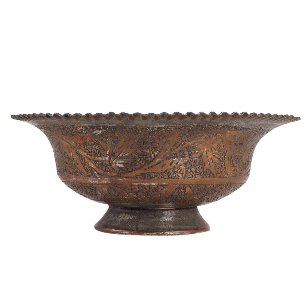 This antique brass bowl has a rich enamel coating, lovely floral motifs, and scalloped sides. It can be used as a fruit dish or a flower vase. The exterior as well the interior of  the bowl has a beautiful old age patina finish. Give it to friends and family as a gift.