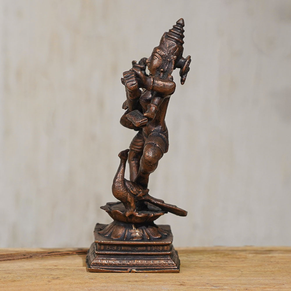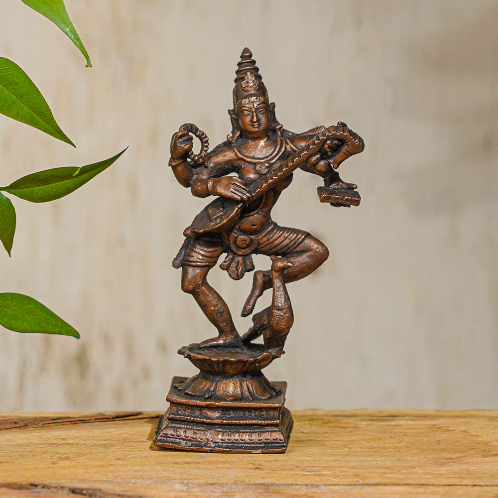 The beautiful copper statue of Goddess Saraswati is an exquisite masterpiece, handmade by skilled Indian artisans using high-quality copper, an auspicious metal known for its healing properties. The statue depicts the goddess playing her musical instrument veena while gracefully dancing, reflecting her divine persona. It is a perfect addition to any home or office prayer room, and can also be used as a stunning decor piece or a unique collectible item. The statue of Goddess Saraswati, the goddess of knowledge, music, and art, symbolizes the pursuit of wisdom and enlightenment. Its intricate details and craftsmanship bring life to the deity's essence and character, making it an exceptional god showpiece. You can easily buy Goddess Saraswati Murti online and use it as an offering during prayers, meditation, or any auspicious ceremonies. It also makes an ideal gift for family, friends, and relatives on special occasions such as weddings, housewarming, and festivals. Owning this stunning and divine statue of Goddess Saraswati is a true blessing that brings peace and harmony to your life.