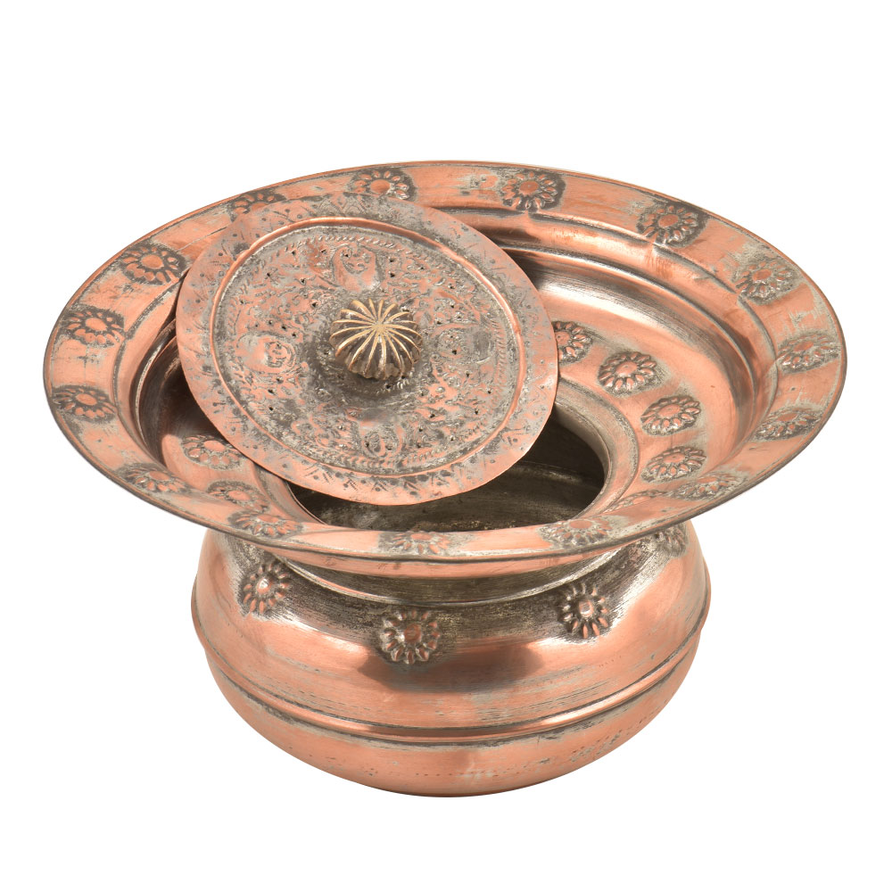Handmade Copper Ugal-Daa (Spittoon) is a receptacle made for spitting into, especially by users of chewing and dipping tobacco. It can also be used for decoration purposes or as a tray stand. It is fully decorated with repousse or embossed floral design on the entire Ugal daan.