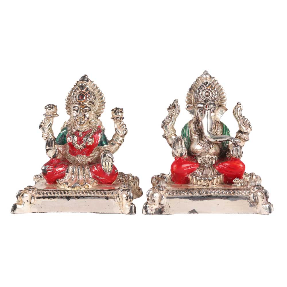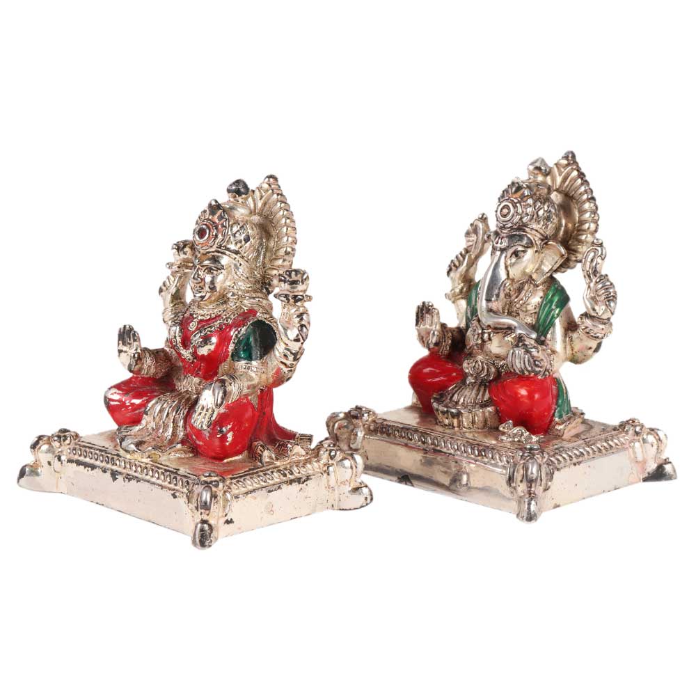 A lovely and one-of-a-kind reproduction of a silver Laxmi Ganesh murti pair with ornament enamel features sitting on a round raised platform. This silver Laxmi Ganesh murti pair is ideal for showcase, donating, poojas, or collecting. These Laxmi Ganesha idols are coated with silver layer on the outside and filled with solid copper metal on the inside. The clothes are painted red and green, making them very colourful.