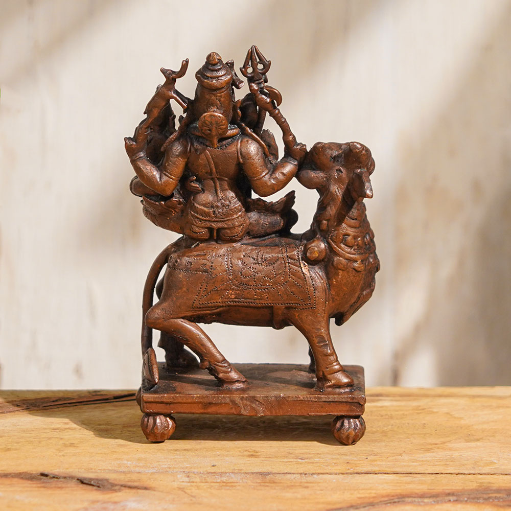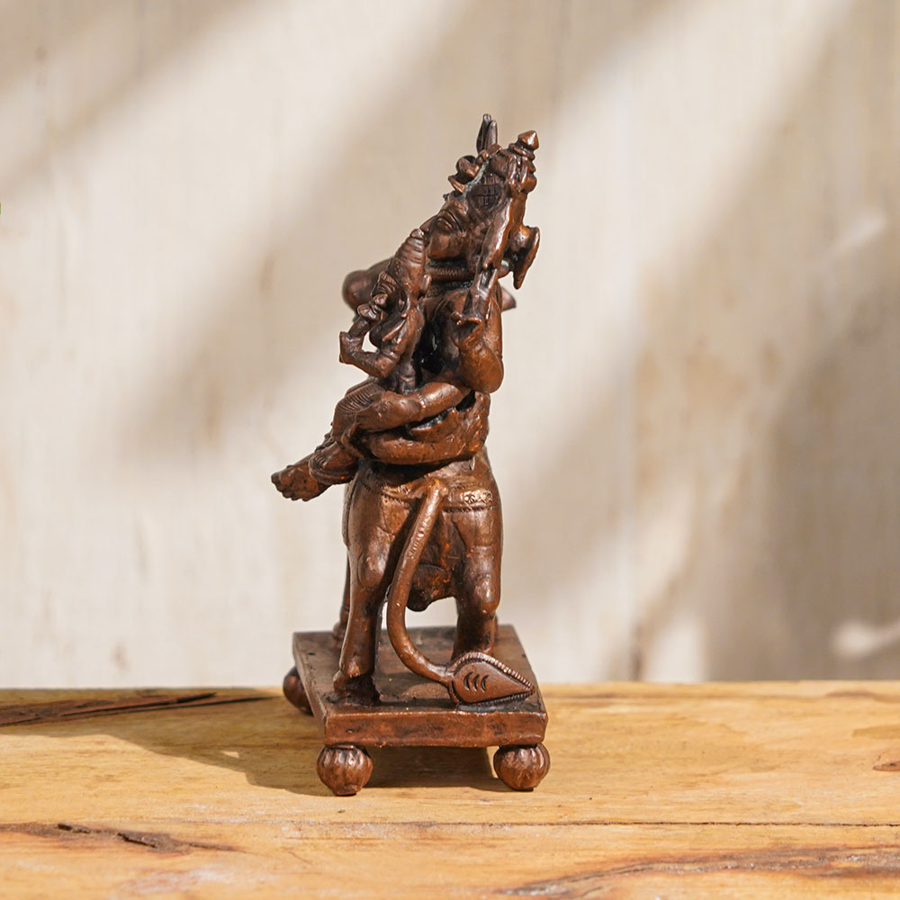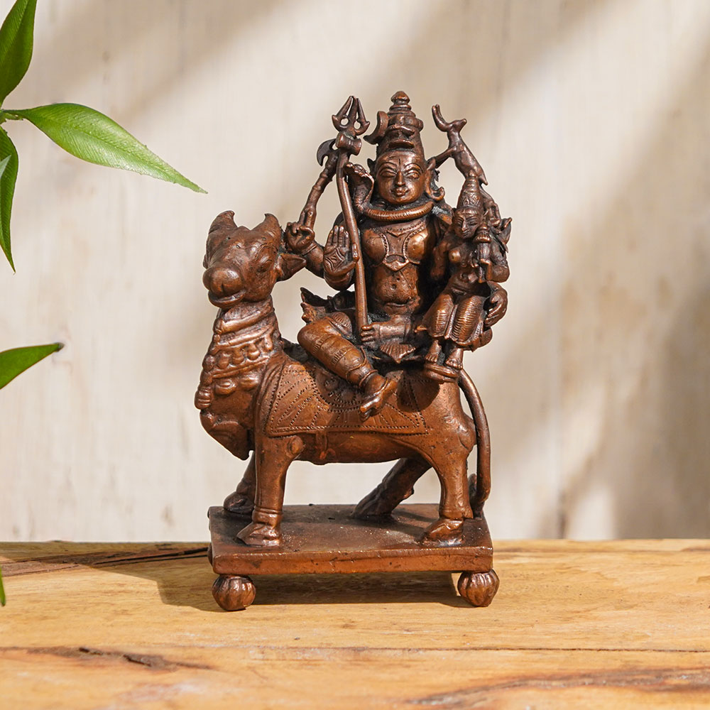 Buy Lord Shiva murti online and bring the divine presence of Lord Shiva and Goddess Parvati into your home, enhancing your spiritual practice and adding a sacred ambiance to your space. This captivating copper statue features Lord Shiva, the powerful and auspicious deity of Hinduism, seated on his vahana Nandi, with his consort, Goddess Parvati, sitting gracefully on his lap. Handmade by highly skilled and experienced Indian artisans, this Lord Shiva murti is crafted with intricate details, showcasing the divine union of Lord Shiva and Goddess Parvati in a mesmerizing form. It is ideal for worshipping in your home temple or as a revered centrepiece in Indian temples, invoking the blessings of Lord Shiva and Goddess Parvati for peace, prosperity, and happiness. Its intricate craftsmanship and exquisite design make it a timeless addition to your home decor, adding a touch of divine grace and spirituality to your surroundings. It also makes an auspicious gift for your loved ones on special occasions, symbolizing your reverence and blessings towards them.