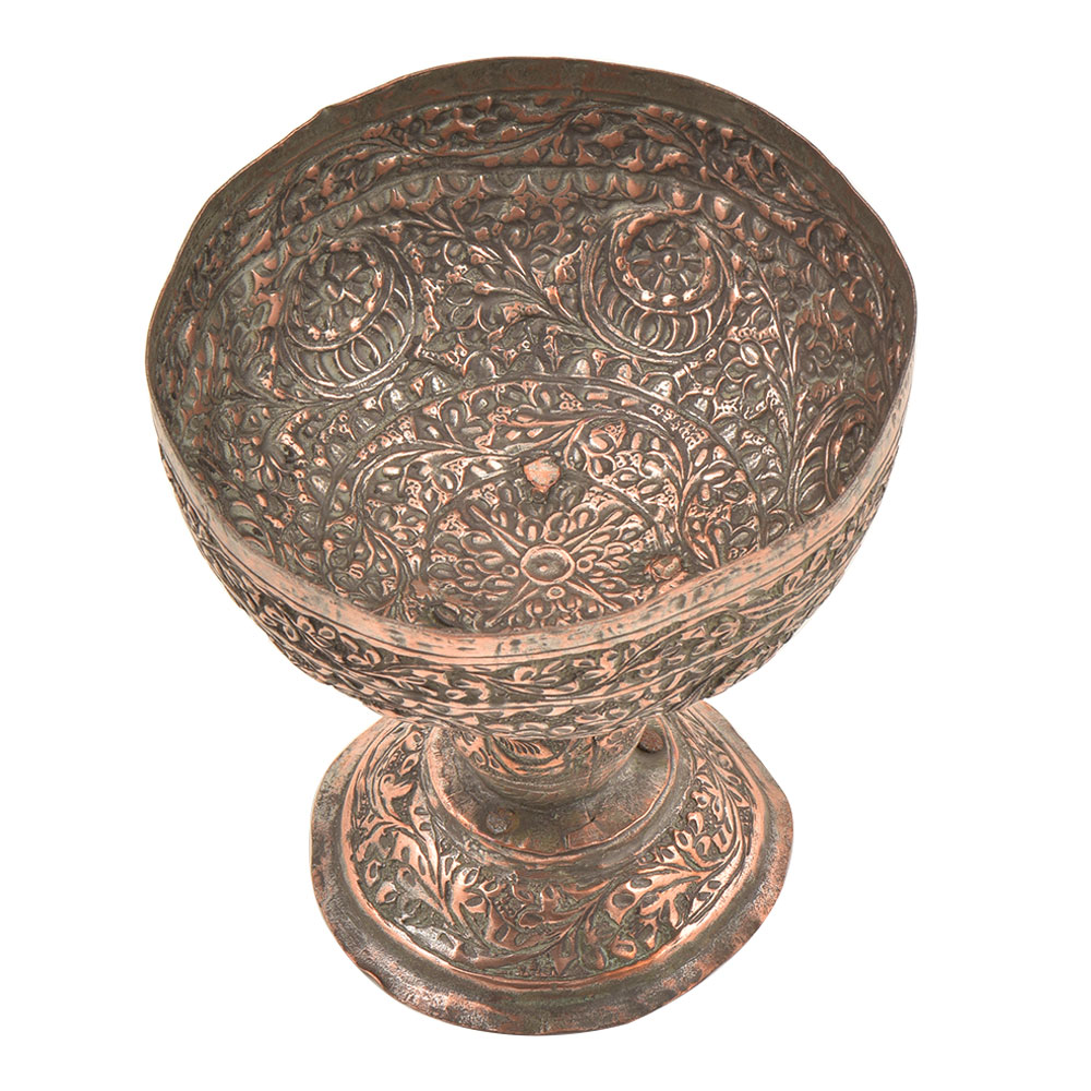Handmade Copper ovoid bowl with encircling chased and engraved floral decoration in a circular pattern on the bowl and also on the lower half of the bowl with repousse floral pattern on ground, it has engraved floral design raised on a tapering stem from a circular foot with conforming milled engraving on the foot.