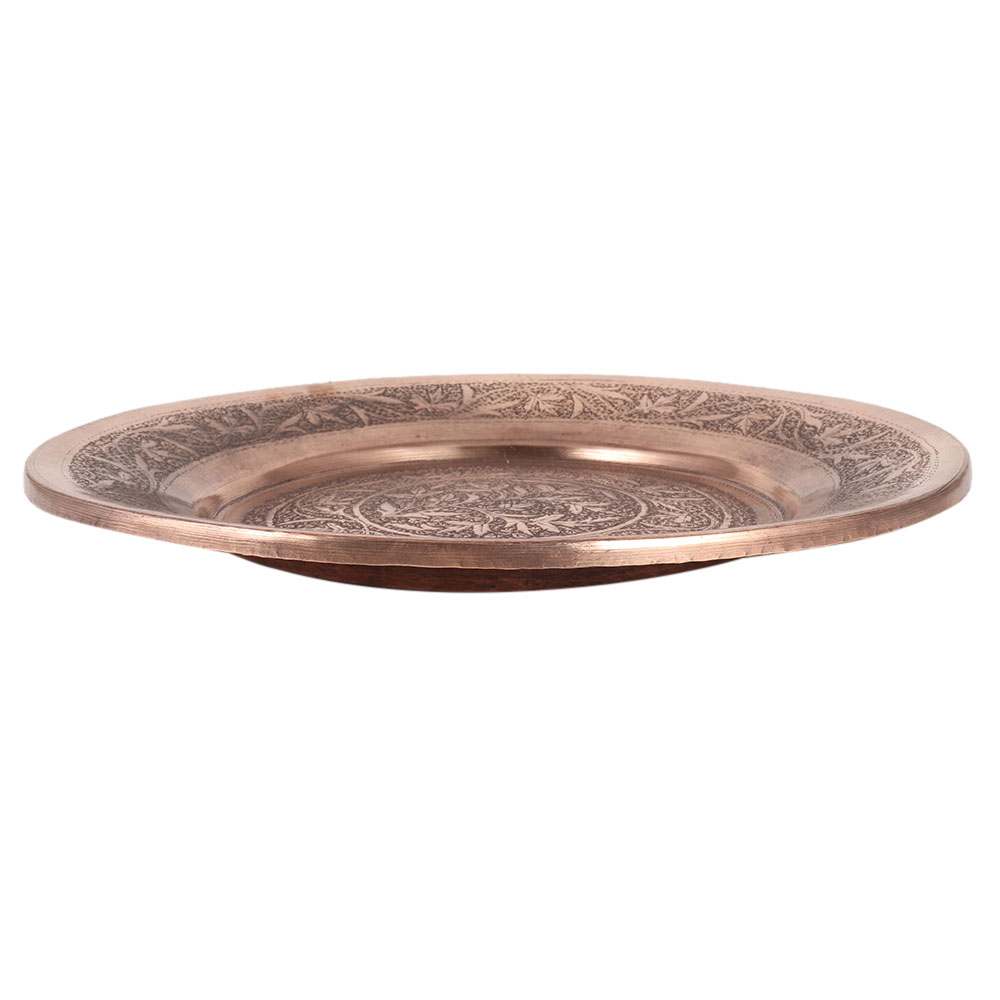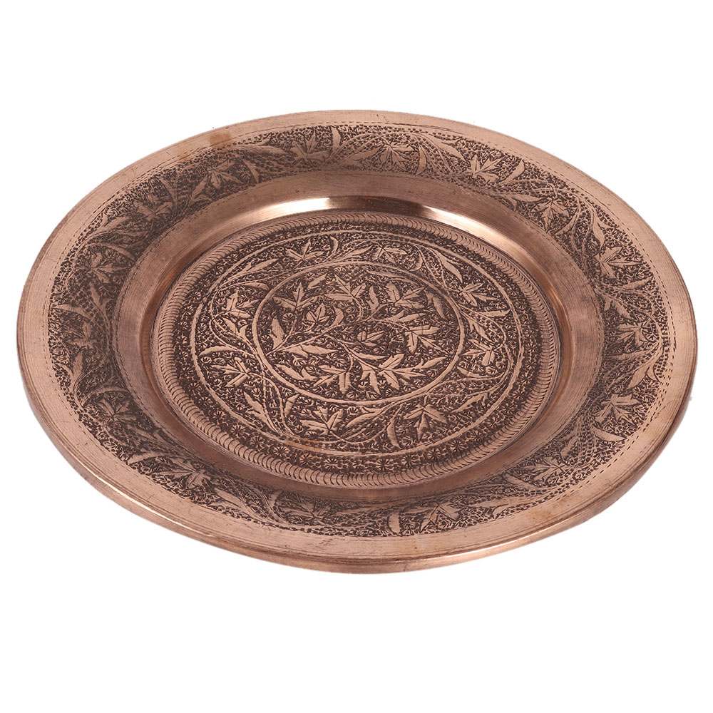 Vintage handcrafted design form, heavy gauge, hand wrought copper plates with intricately detailed floral motifs. The lovely and pleasant patination of the copper metal and its inherent tarnish enhances the incredible hand tooling and hammered background of floral sprigs and flourishes.