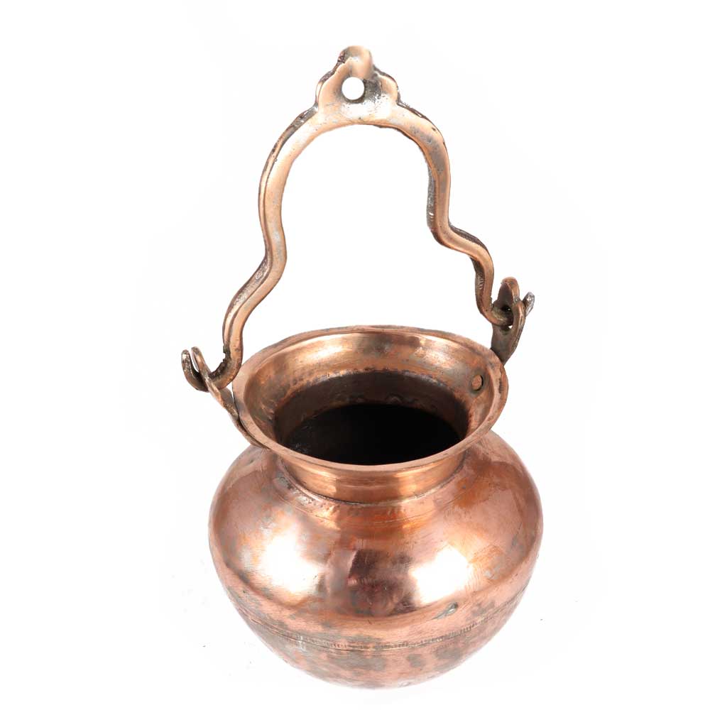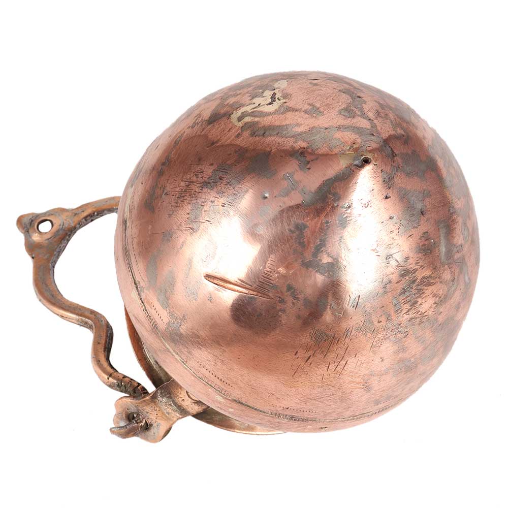This is a copper Shiv Linga Dhara Water Container or Jaladhara with chain to suspend the round shaped vessel above the Shiva Linga for continuous long abisegam. A small aperture in the pot allows a small quantity of holy water to be constantly dropped on the Shiva Linga for a longer length of time. Dhara Patiram is composed of high-quality copper metal and has a storage capacity. It is intended for usage in households and temples.