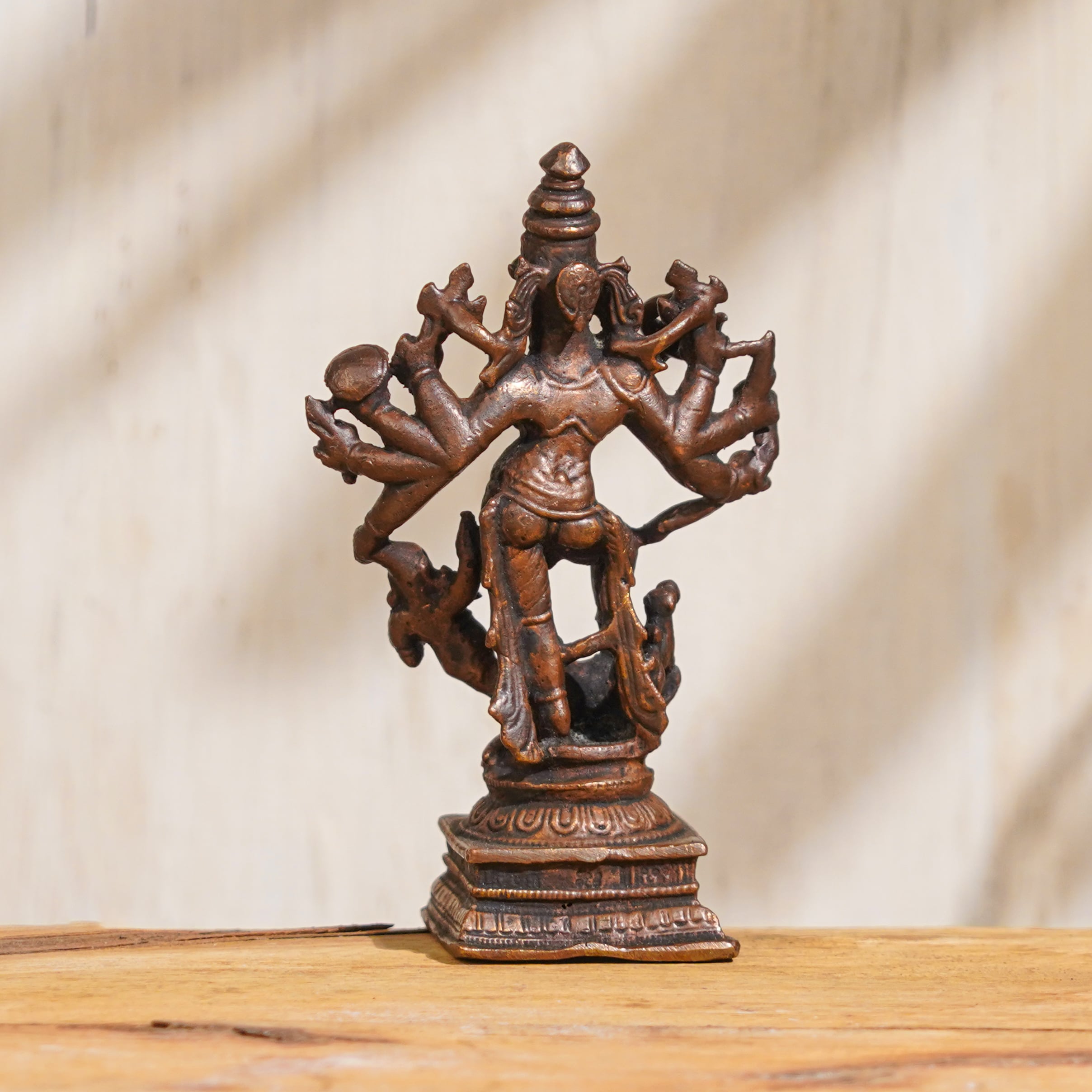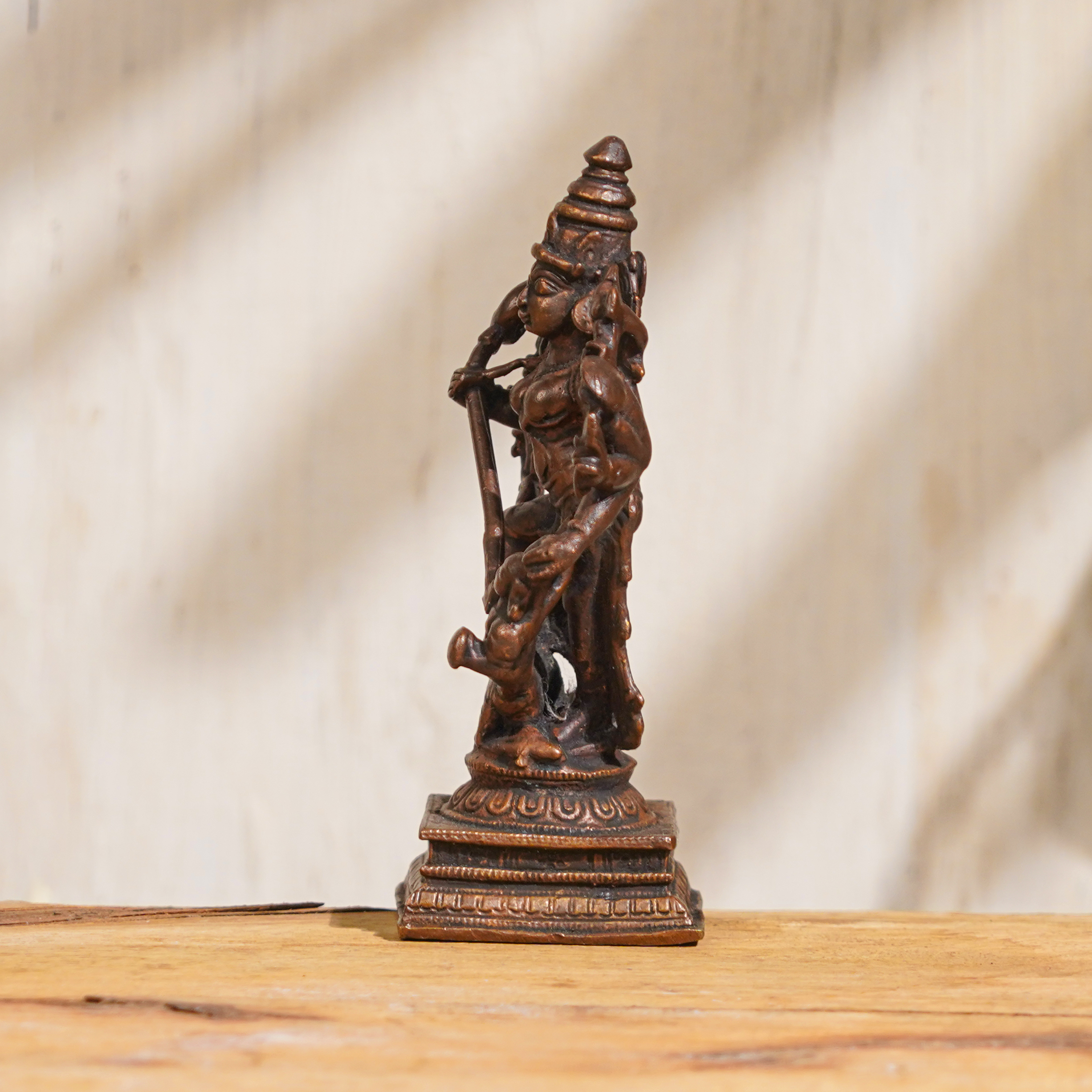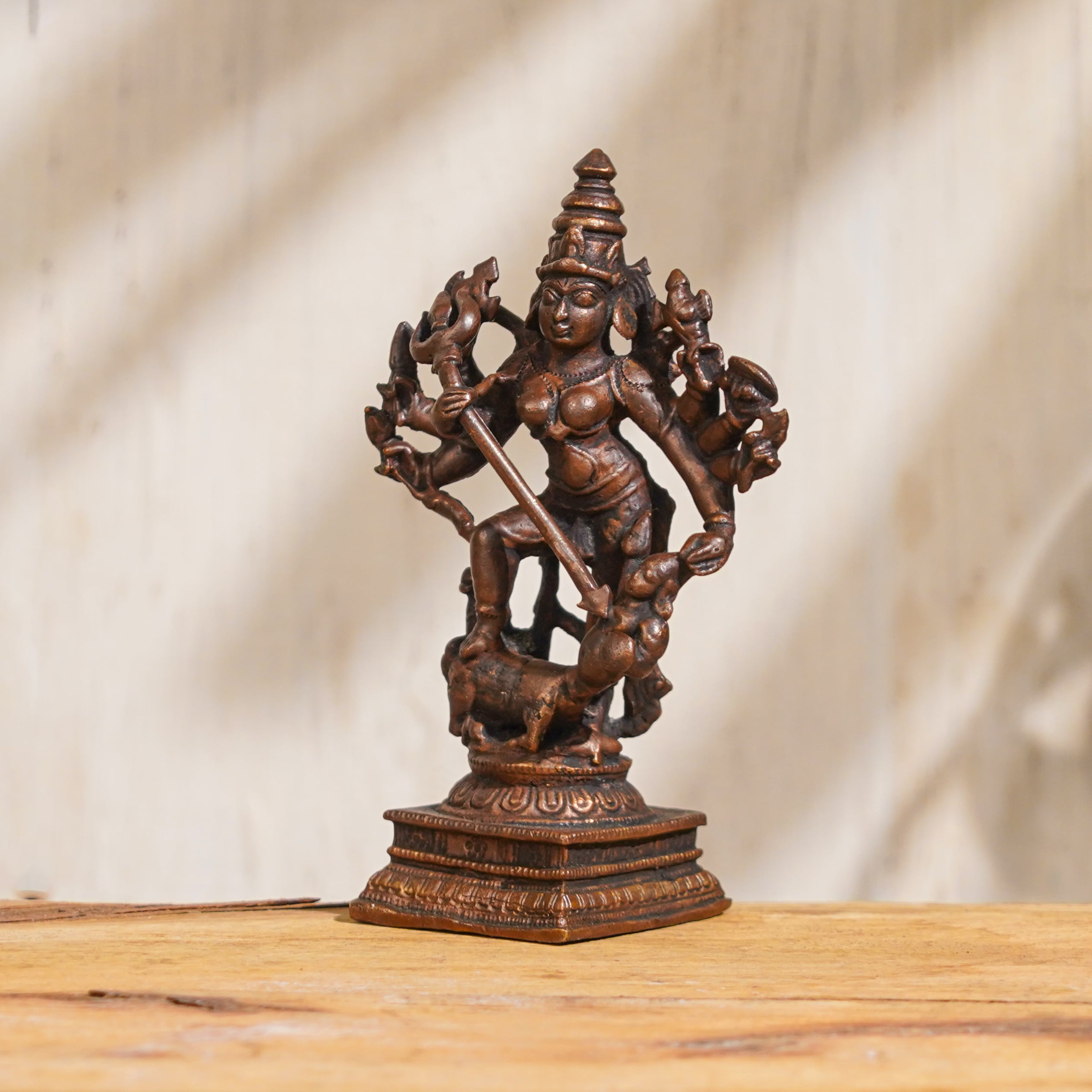 Celebrate the eternal victory of good over evil with this exquisite copper statue of Goddess Durga slaying the demon Mahishasura. With meticulous attention to detail, this stunning murti captures the grace and power of the goddess, depicted in a classic standing pose with her foot resting on the defeated demon. Ideal for use in a home temple or prayer room, this Goddess Durga idol is a perfect addition to your sacred space. Its intricate craftsmanship and exquisite design make it a worthy centrepiece for worship, inviting blessings of prosperity, abundance, and auspiciousness into your home. Not just for religious purposes, this copper statue of Goddess Durga also makes a captivating piece of home decor. Its radiant aura and elegant appearance make it a thoughtful gift for loved ones on auspicious occasions such as weddings, housewarmings, or festivals. Invoke the divine blessings of Goddess Durga into your home with this exquisite copper statue and experience the divine aura of prosperity and positivity that it brings.