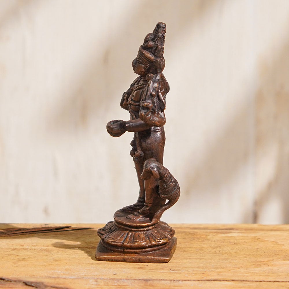 The Copper Lord Bhairava Murti is a stunning handmade statue of Lord Bhairava, one of the most revered deities in Hinduism. This magnificent statue depicts Lord Bhairava standing with his Vahana dog (Shvan) and has been crafted by skilled Indian artisans from high-quality copper. Copper is believed to be an auspicious metal, making this statue perfect for worship in your home or office prayer room, or at the temple. This idol of God is not only a religious symbol but also a beautiful piece of art that can be used for decoration or collection. It's perfect for anyone who wants to have a piece of Hindu mythology in their home or office. You can also gift it to your family, friends, or relatives on special, festive or auspicious occasions. If you are looking to buy Lord Bhairava statue online, this handmade copper statue is an excellent choice. It is a testament to the skilled craftsmanship of Indian artisans and will bring an aura of spirituality and peace to any space. So, whether you're looking to add to your collection of religious artefacts or simply seeking a beautiful decorative piece, this Lord Bhairava statue is a must-have.