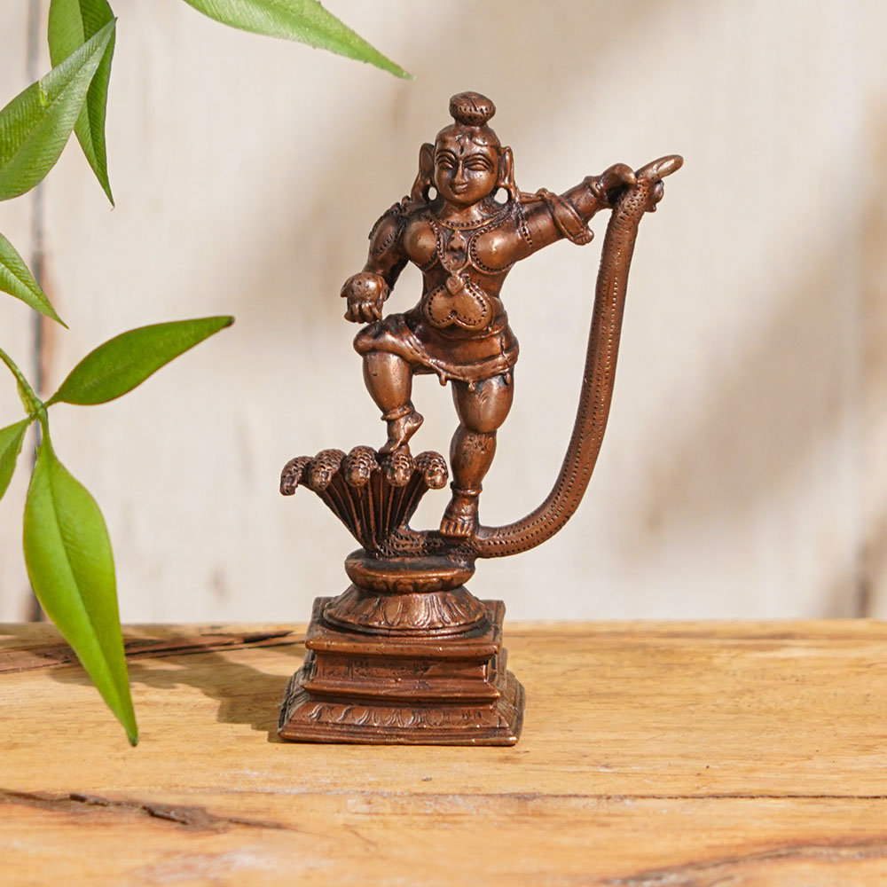 • Copper Statue Of Lord Krishna Dancing On Kaliya, The Venomous Snake