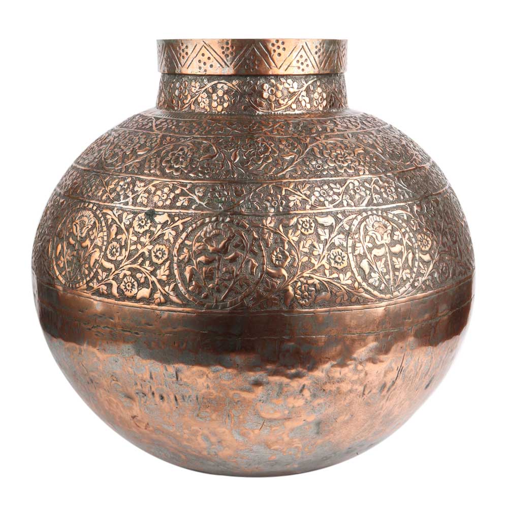 Decorative Copper Pot is etched with detailed floral and leaf designs in perfect mughal style. Flower vase, stage decoration, wedding gift, anniversary gift, hotel and spa decoration. Indoor and outdoor decoration, gift for near and dear ones.