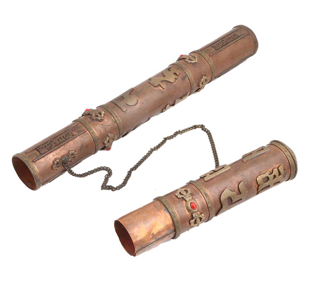 This Copper With Brass Tibetan Scroll Holder with lettering and beading done by the local artisans. The scroll has a lid that is attached with a rustic metal link chain. Wedding gift,souvenir,table decoration, Diwali gift,christmas gift for your near and dear ones.