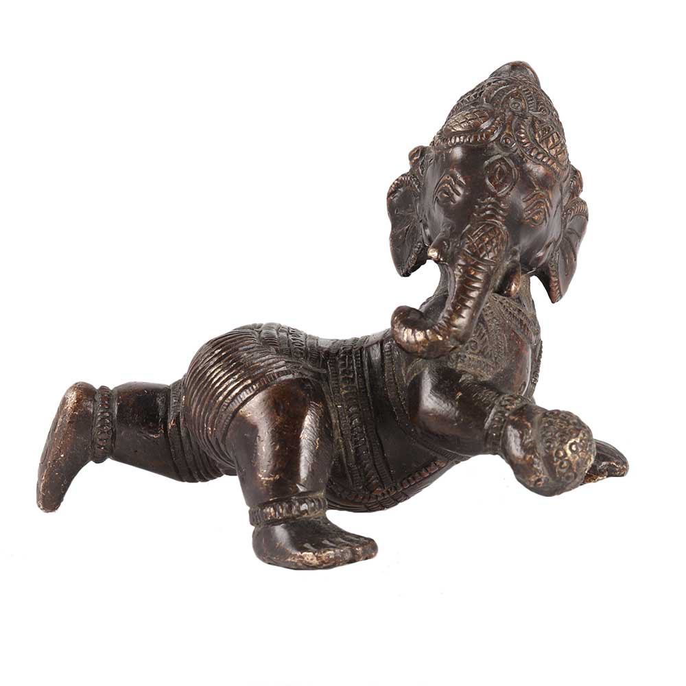 The details on this brass statue are marvelous. Excellent desktop paperweight statue. Here  Ganesh is depicted as a young man. His elephant head is regarded as a symbol of wisdom. His head usually has one full tusk and one damaged. It is said that he either lost it in a battle or used it to dictate the Mahabharata to the sage Vyasa. A rat serves as his mount.