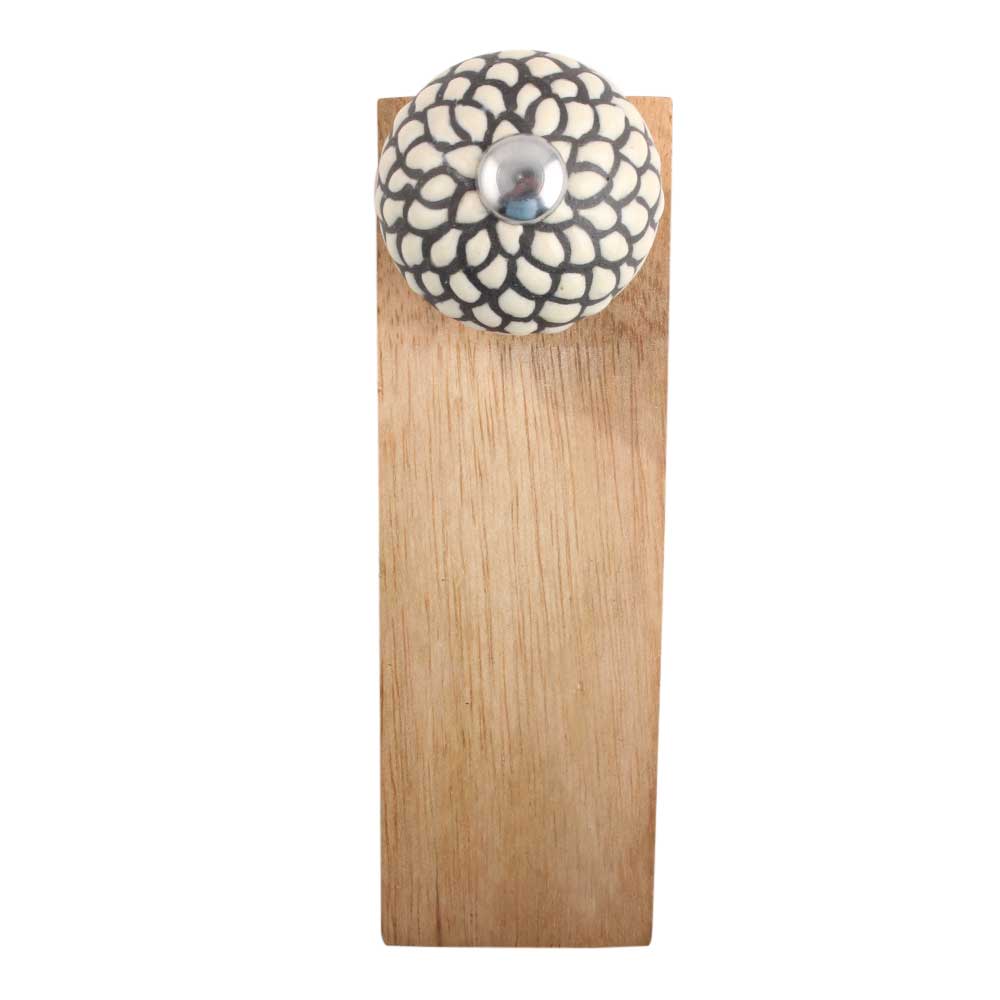 Indianshelf.com for bulk/wholesale orders.Indianshelf.us for personal purchases.The Cream and Black Etched Ceramic Wooden Door Stopper is a beautifully crafted home accessory that combines elegance and practicality. The intricate etching on the ceramic body, paired with the sturdy wooden base, adds a touch of sophistication to any room. Whether you need to keep doors secure or want to enhance your space with a subtle design, this door stopper offers both functionality and style.