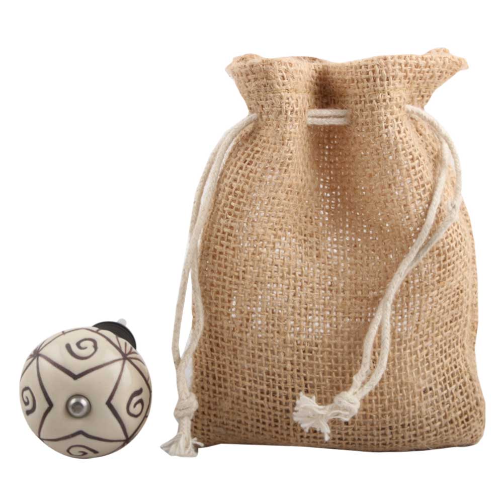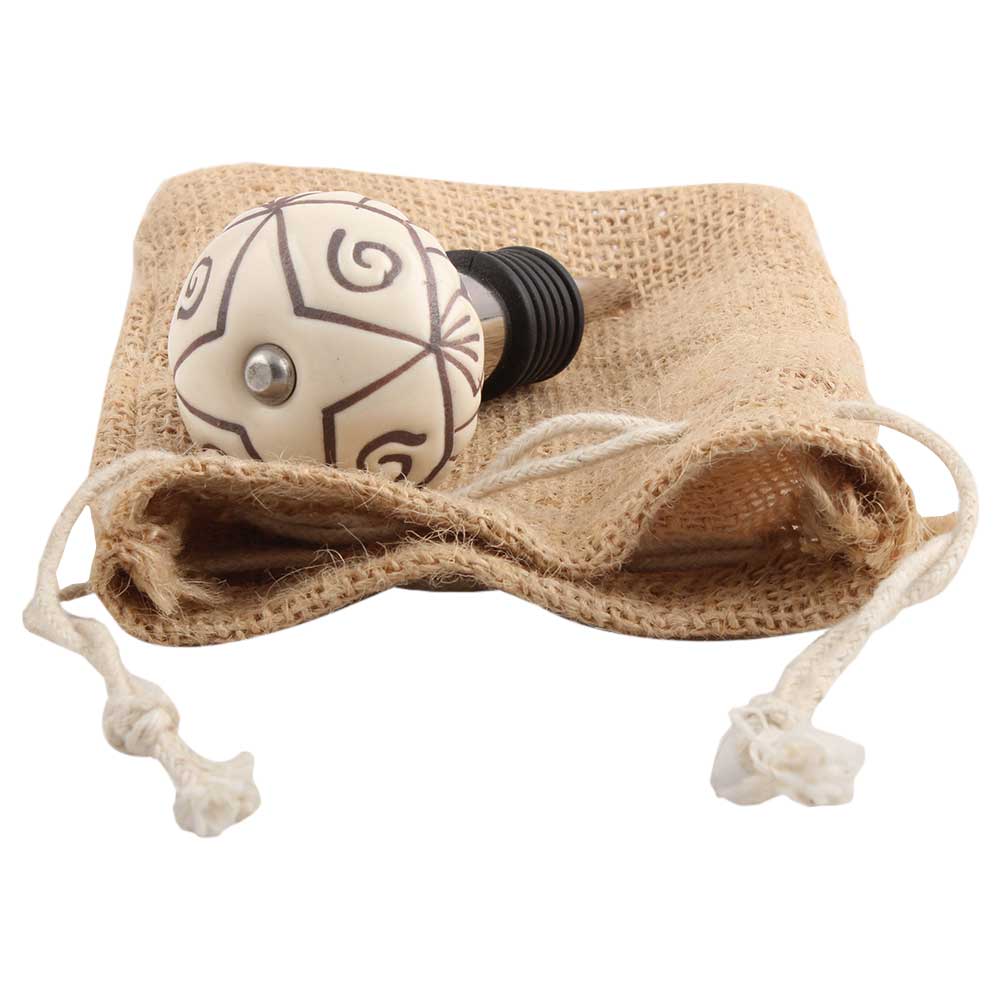Cream Base Brown Etched Ceramic Wine Stopper.zinc alloy wine bottle stopper with attractive Jute Bag Packaging.