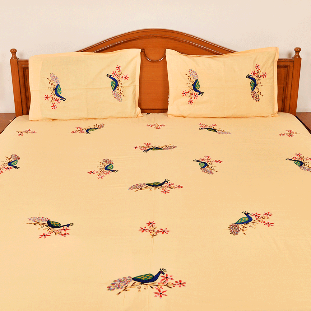 Handmade Cream Bed Linen With Peacock Design Cotton Bed sheet With Two Pillow Covers.