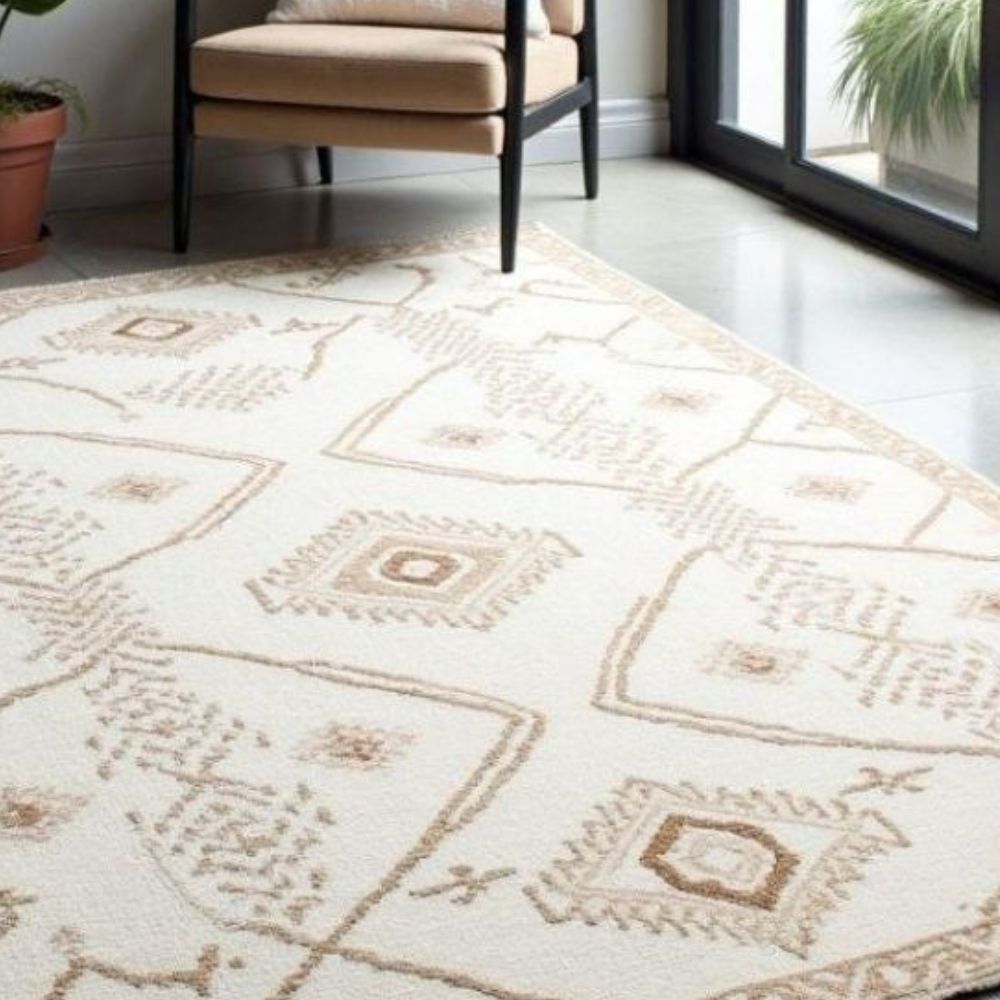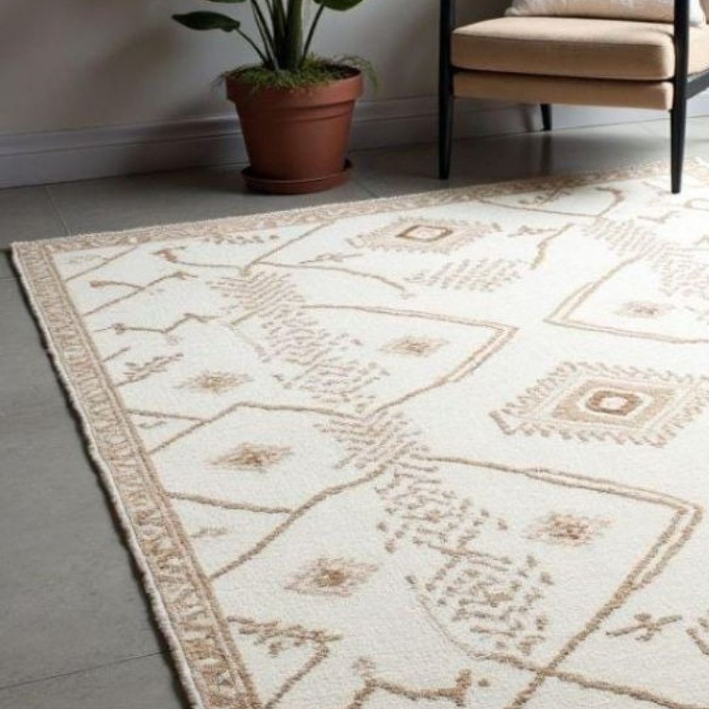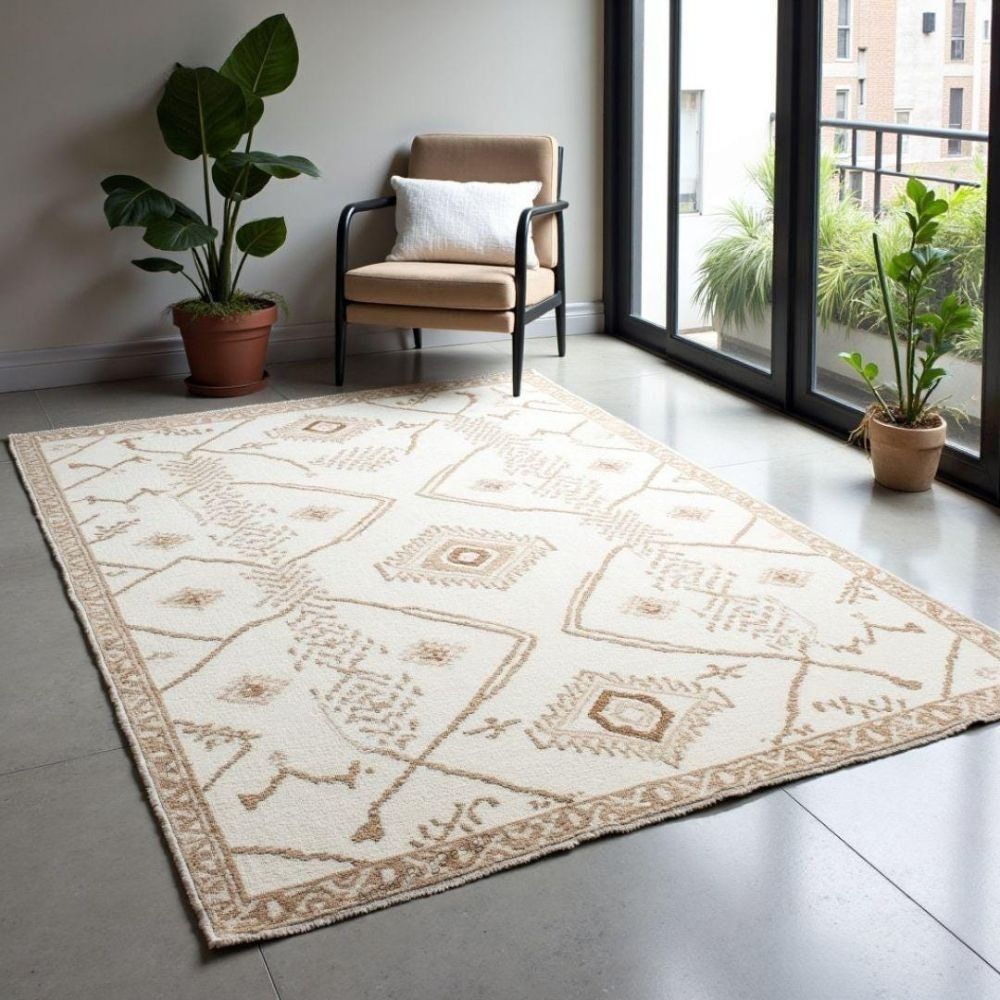 Each rug is meticulously hand-knotted by skilled artisans, making every piece one-of-a-kind. Details: Type: Hand Knotted Rug Material: 100% Wool Colors: Cream & Beige Design: Moroccan geometric pattern Durability: Long-lasting, heirloom-quality piece Texture: Soft underfoot with natural warmth This rug adds a modern yet classic touch to any space from living rooms and bedrooms to offices and studios. Its neutral tones blend seamlessly with different interiors, offering both comfort and style. Note: Slight variations in color and weave are natural in hand-knotted rugs, making each piece unique. As it Appears Pack of One Piece.