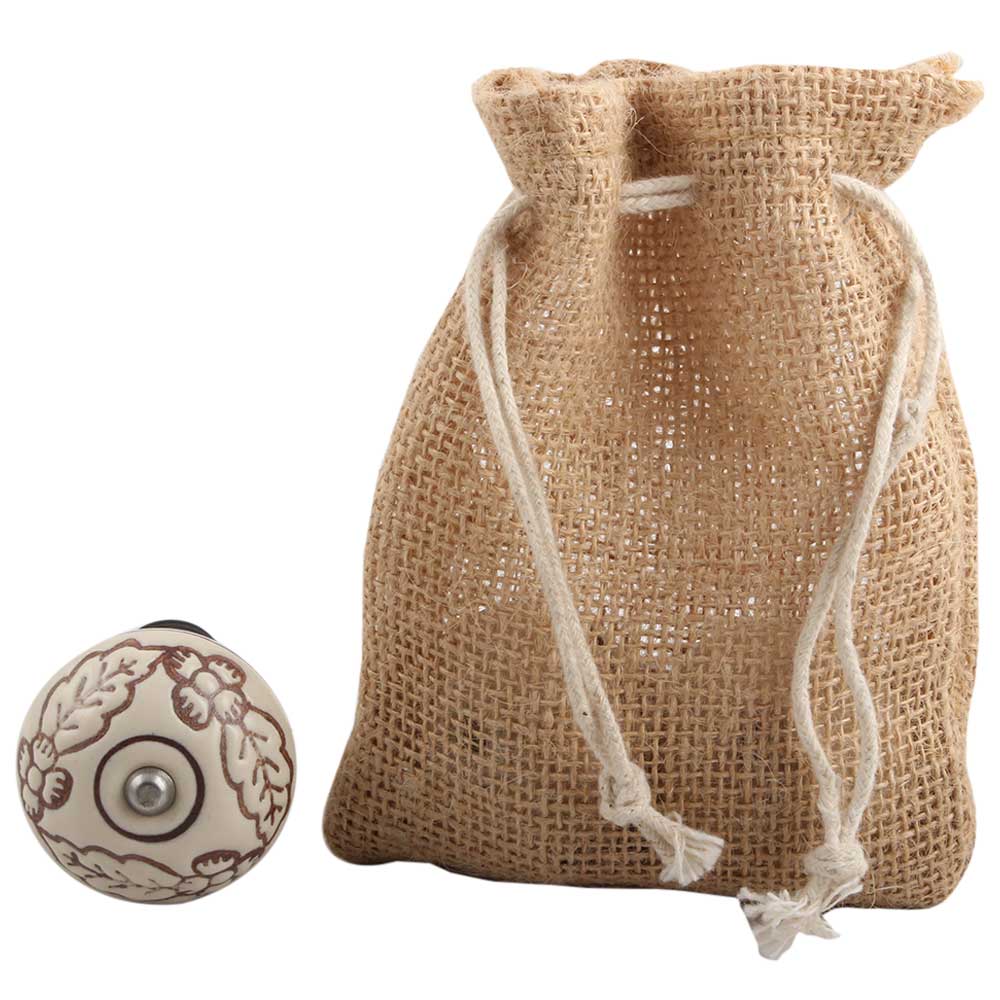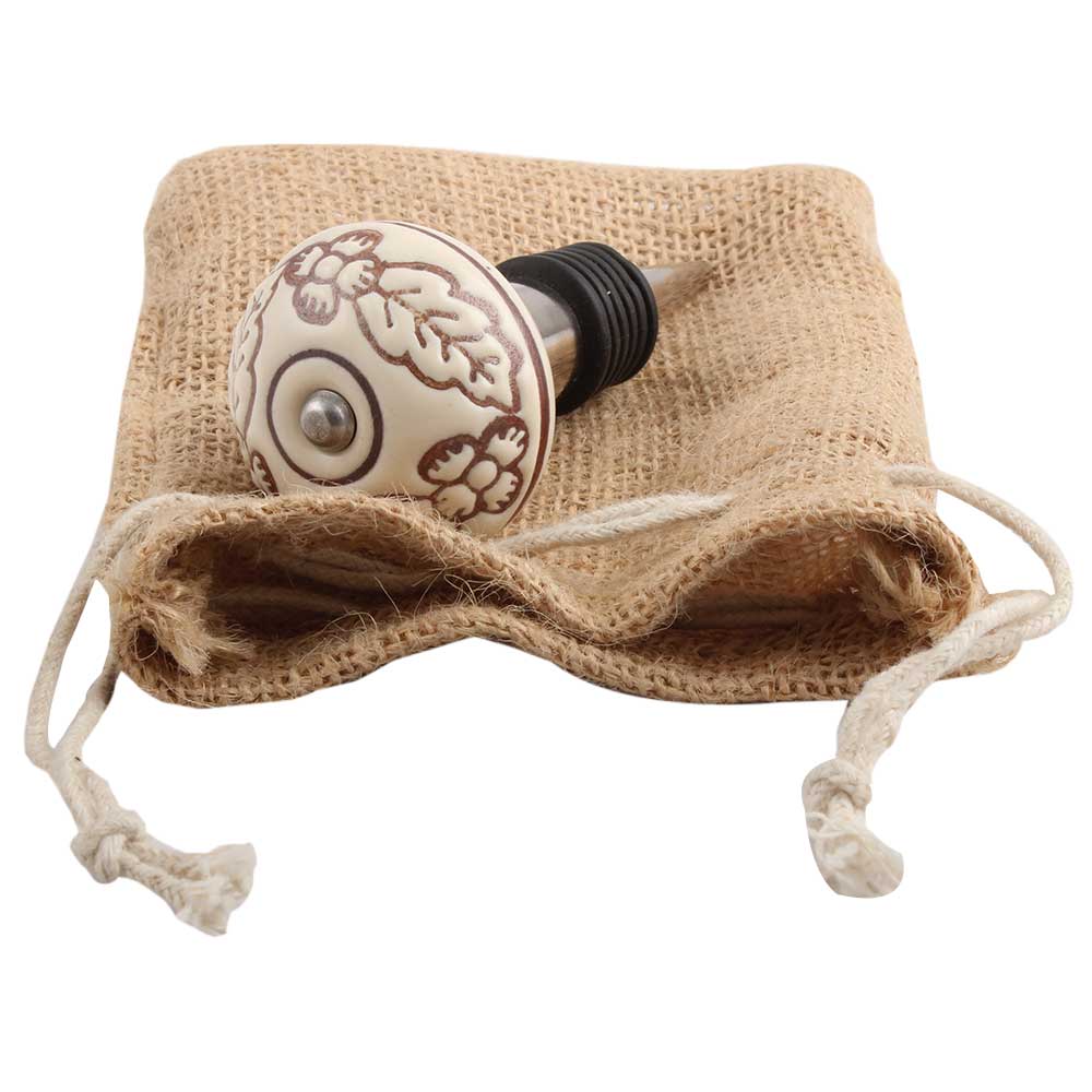Cream Brown Leaf Flower Etched Ceramic Wine Stopper.zinc alloy wine bottle stopper with attractive Jute Bag Packaging.