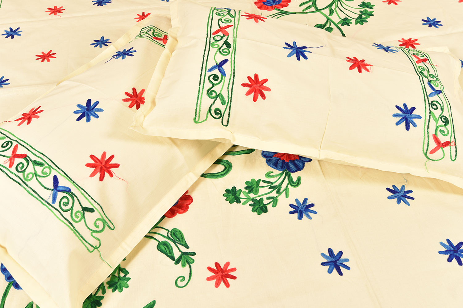 Cream Bed Linen with Multicolor Floral Design . Hand crafted supporting eye capturing designs and colours.