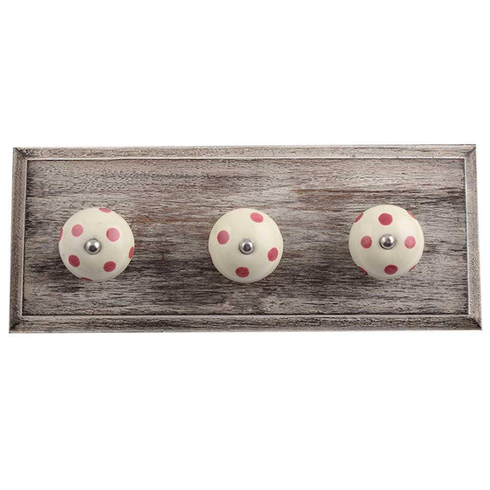 Cream Pink Dot Wooden Hooks. A Perfect Complement to the Soft Tone of the Wood are these White Traditional Hat Coat Hook Made of Genuine Porcelain and Brass. It can be use to Hang Jewellery, Leashes, Towels, Scarves, Light Weight Sweaters, Caps Etc.