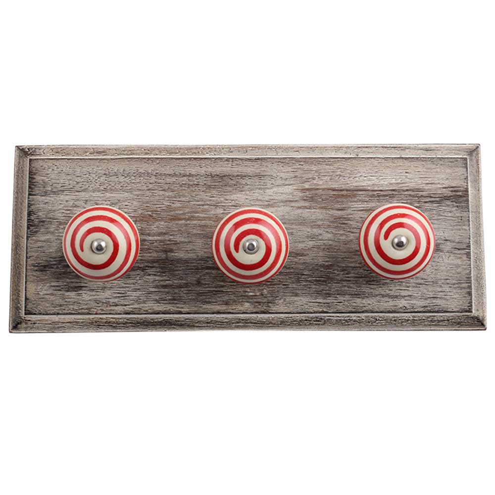 Cream Red Strip Wooden Hooks. A Perfect Complement to the Soft Tone of the Wood are these White Traditional Hat Coat Hook Made of Genuine Porcelain and Brass. It can be use to Hang Jewellery, Leashes, Towels, Scarves, Light Weight Sweaters, Caps Etc.
