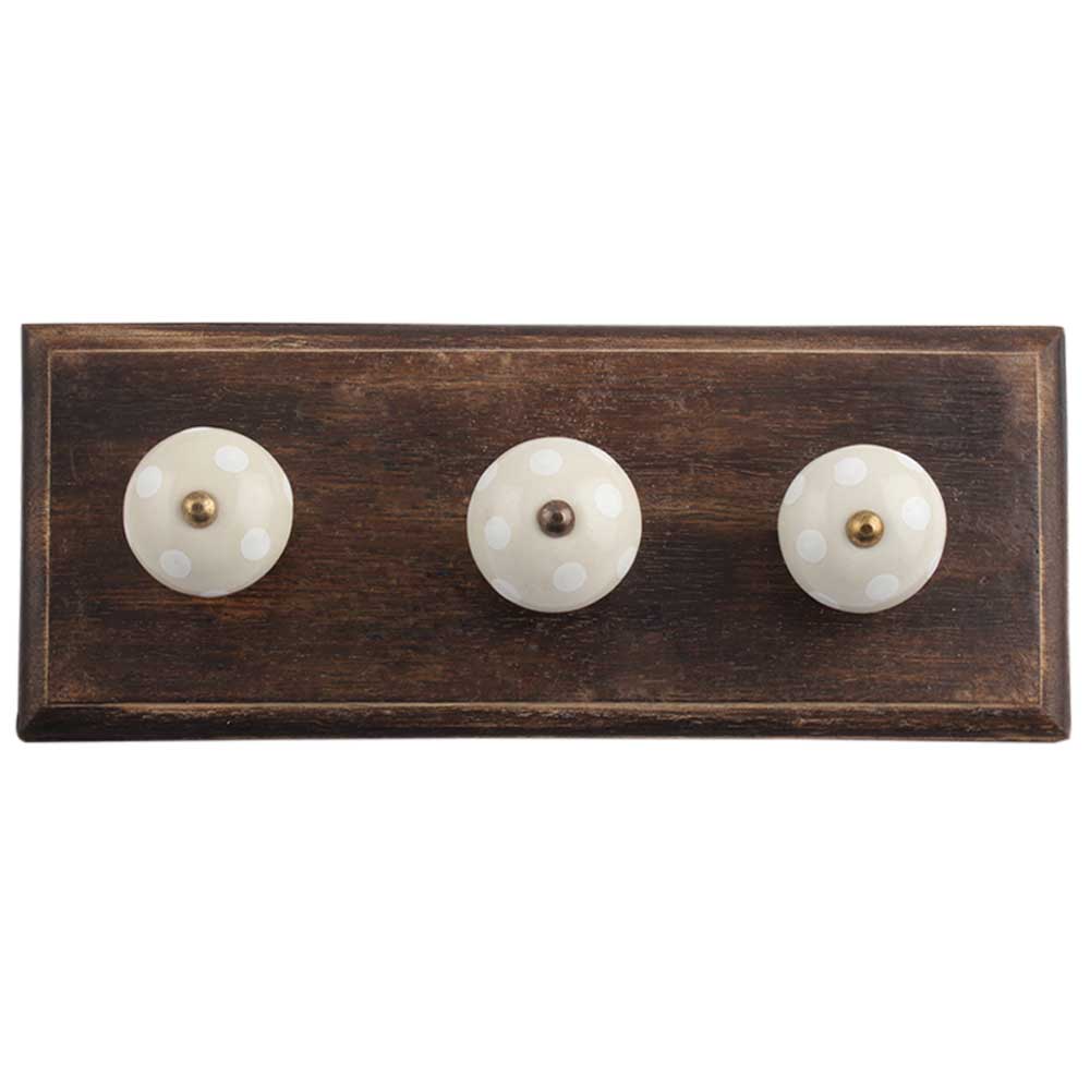 Cream White Dot Wooden Hooks . A Perfect Complement to the Soft Tone of the Wood are these White Traditional Hat Coat Hook Made of Genuine Porcelain and Brass. It can be use to Hang Jewellery, Leashes, Towels, Scarves, Light Weight Sweaters, Caps Etc.