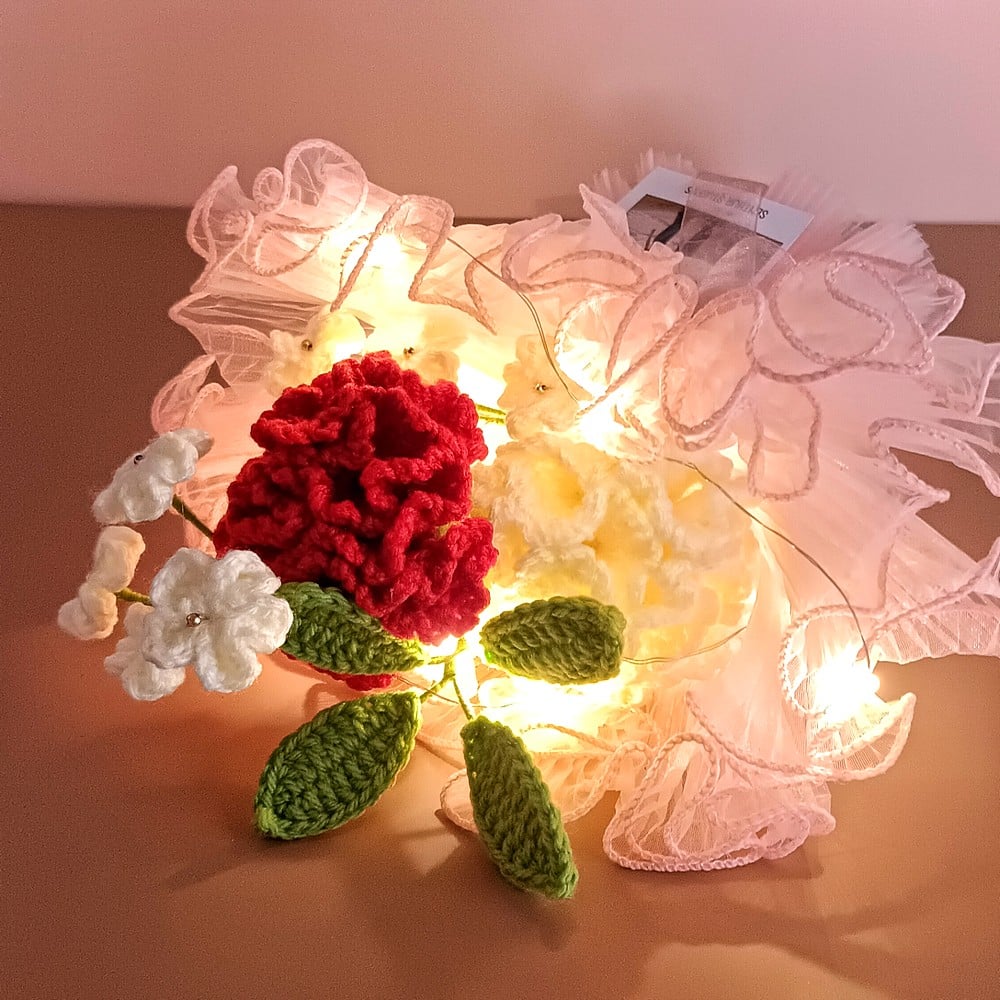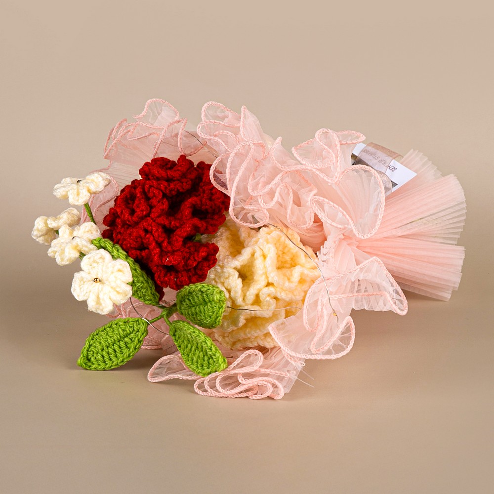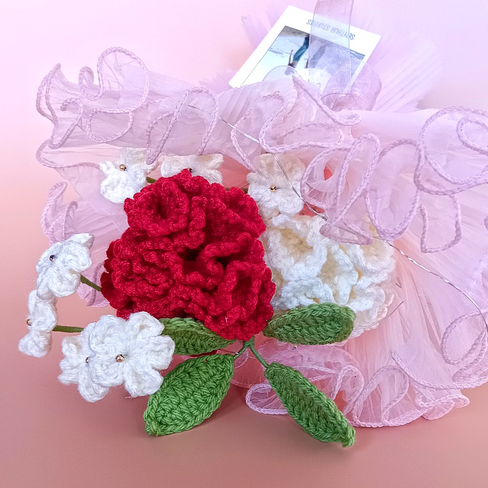 Keep your red crochet piece away from moisture and direct sun to prevent dust and fading. Dust gently with a soft brush or a hairdryer on cool, and reshape stems carefully if needed.