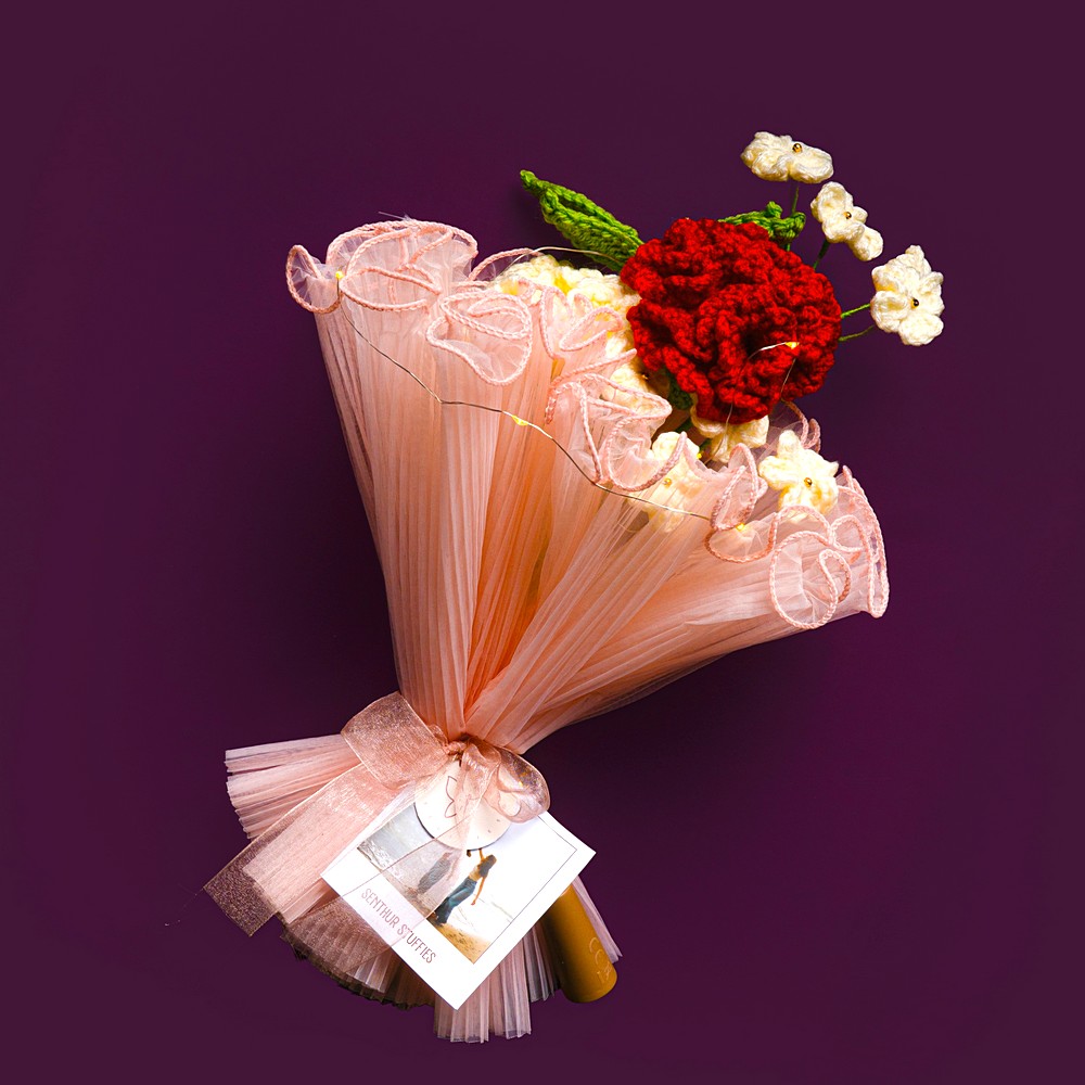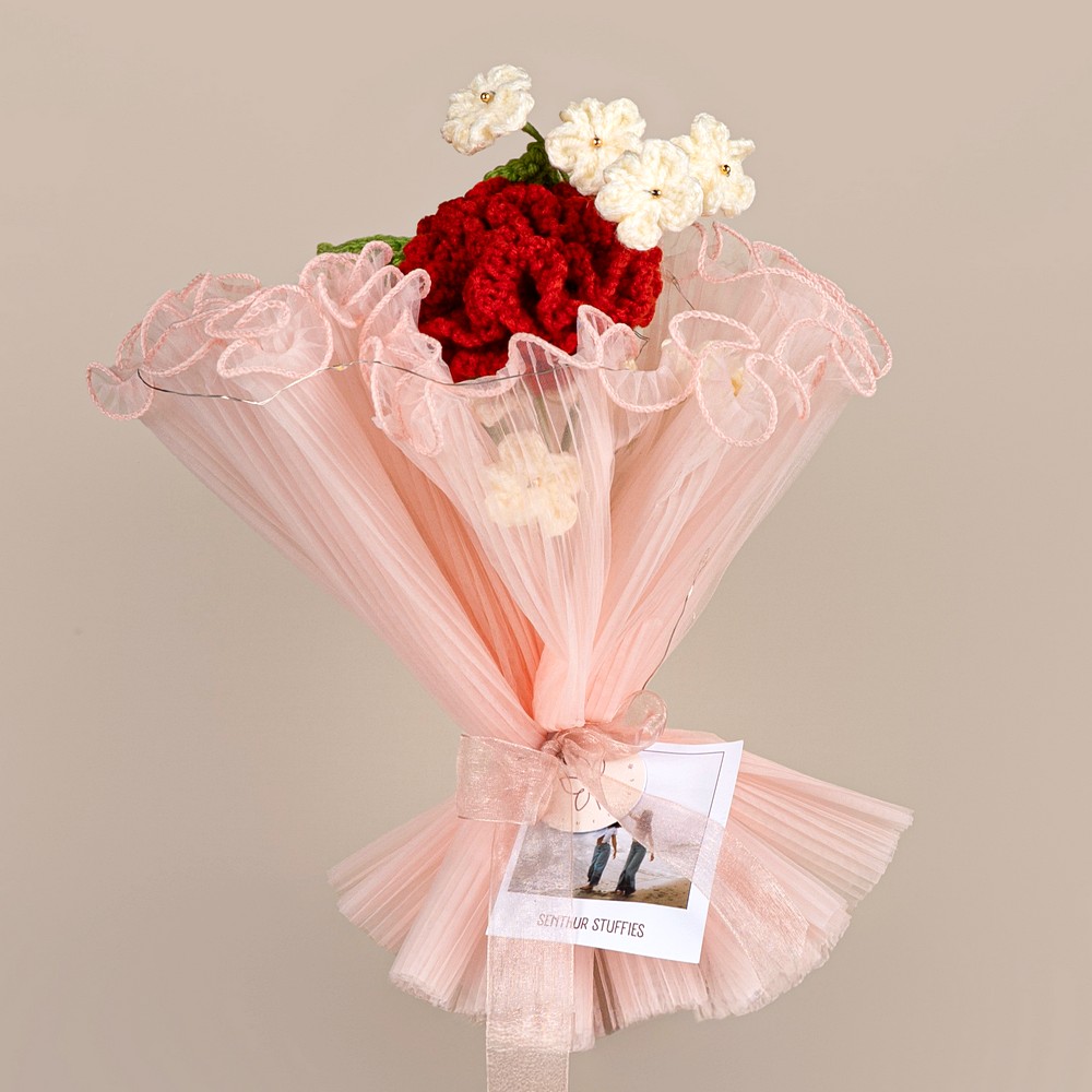 This red petal bunch is lovingly crafted from soft acrylic yarn, fibre filling and craft wire, offering a chic accent. Perfect for artisanship enthusiasts, it exudes hand-crafted charm and lasting appeal. Packed and quality-checked by Indianshelf. Each stitch is a testament to traditional artistry.
