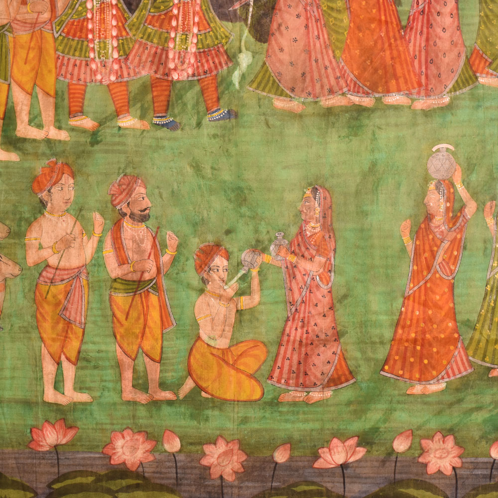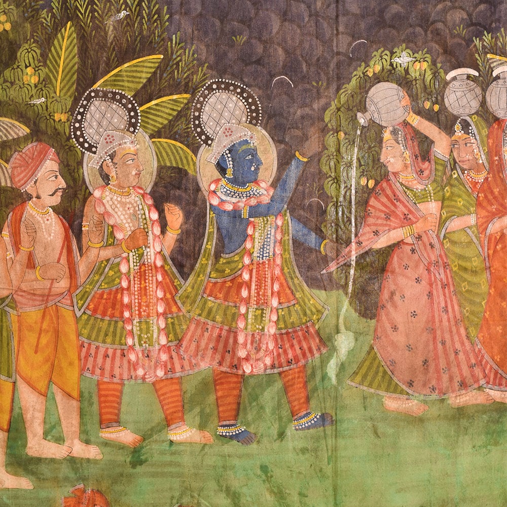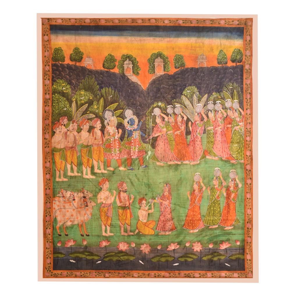 The Dana Picchvai Lila Pichwai Painting is a classic genre of Indian art that represents Lord Krishna's beautiful pastimes. The artwork is done on a massive piece of fabric and is often hanging behind Lord Krishna's image in temples, where it is believed to bring good fortune and blessings to followers. The picture by Dana Lila Pichwai portrays Lord Krishna stealing butter from the Gopis' houses. The image is detailed and vivid, including characters such as Lord Krishna, the Gopis, and numerous animals. The artwork is formed using natural colours derived from plant extracts and other organic elements, and it is embellished with gold or silver foil to enhance wealth and grandeur. The painting's intricate patterns and intricacies are made using a combination of brushwork and hand-stitching, and the procedure needs excellent talent and patience. The brilliant colours employed in the picture are essential since they are intended to elicit excitement and celebration in the observer. The Dana Lila Pichwai artwork is not just a piece of art but also a devotional and spiritual item. The heavenly pastimes of Lord Krishna represented in the picture are intended to encourage devotion and introspection in the viewer and remind them of the divine's beauty and elegance. Developing a Picchvai of the Dana Lila Pichwai Painting is a time-consuming and labour-intensive procedure requiring high expertise and attention. Dana Lila modern Pichwai Painting Picchvai is a beautiful and complicated style of ancient Indian art with significant spiritual and cultural value. It's vivid colours and intricate designs inspire artists and believers alike, and it is a crucial element of India's rich cultural tradition.