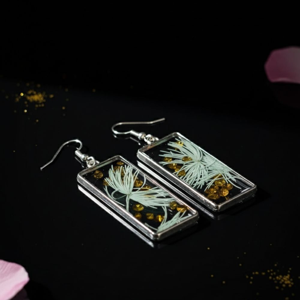 Elevate your look with resin earrings that blend nature and sparkle. Delicate foliage floats beside golden glitter inside a clear rectangle, finished with a sleek silver frame. A perfect accessory for collectors and fashionistas alike. Packed & quality-checked by Indianshelf.