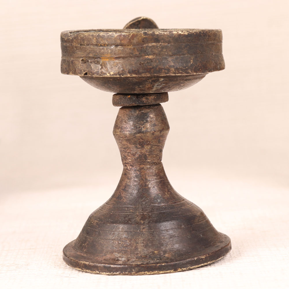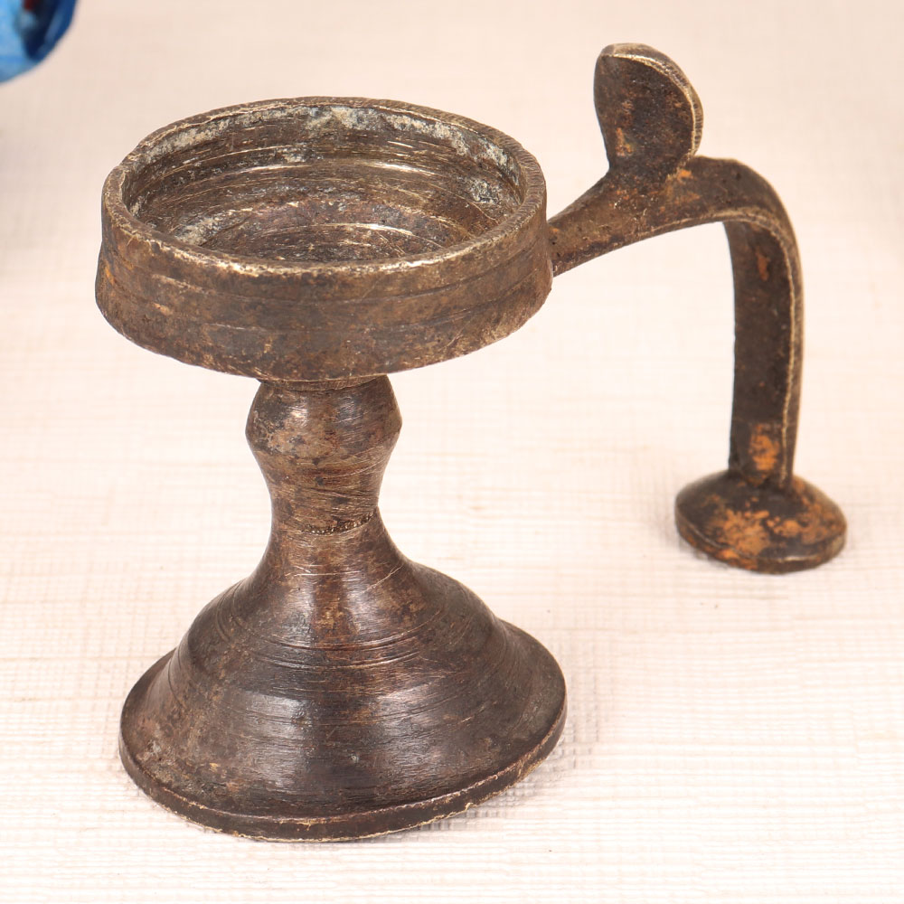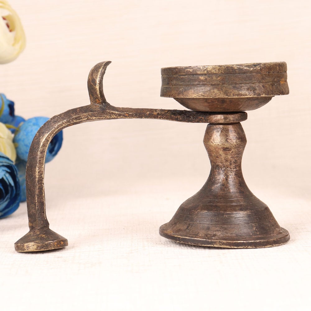 A Vintage Brass Aarti Lamp with a cobra handle that is a testament to the rich cultural heritage of India. Handcrafted by professional artisans from Western India, this masterpiece embodies craftsmanship at its finest. Crafted from high-quality brass and finished in an antique brown patina, it exudes timeless elegance. This versatile lamp is more than just a decorative piece, it's a symbol of tradition and spirituality. Perfect for your home, office, restaurant, hotel, shop, or cafe, it graces prayer rooms during morning and evening rituals, casting a warm and inviting glow. Its intricate cobra handle adds a touch of mystique. Vintage collectors will cherish this unique piece, and it's a stunning addition to any exhibition. To illuminate it, simply use mustard oil or ghee with cotton wicks, infusing your space with a serene ambiance. Celebrate special, festive, or auspicious occasions by gifting this lamp to your loved ones, sharing the warmth of tradition and artistry.
