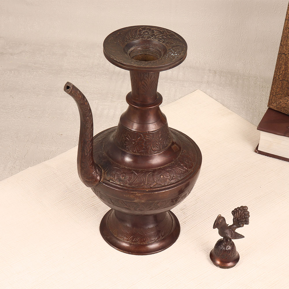 Adorn your living space with the exquisite charm of our Handmade Brass Water Pot. Skillfully crafted by Indian artisans, this pot boasts a timeless design that seamlessly blends traditional artistry with functionality. The pot's exterior is adorned with intricate engravings, showcasing the meticulous craftsmanship that went into its creation. A stunning peacock carving graces the lid, adding a touch of regality to its antique dark brown finish. Made from high-quality brass, this water pot is not only a testament to artisanal expertise but also a versatile decor piece. Whether adorning your home, office, restaurant, hotel, or cafe, its elegance is sure to captivate. Use it as a sophisticated flower pot to infuse natural beauty into your space or present it as a thoughtful gift on special, festive, or auspicious occasions.