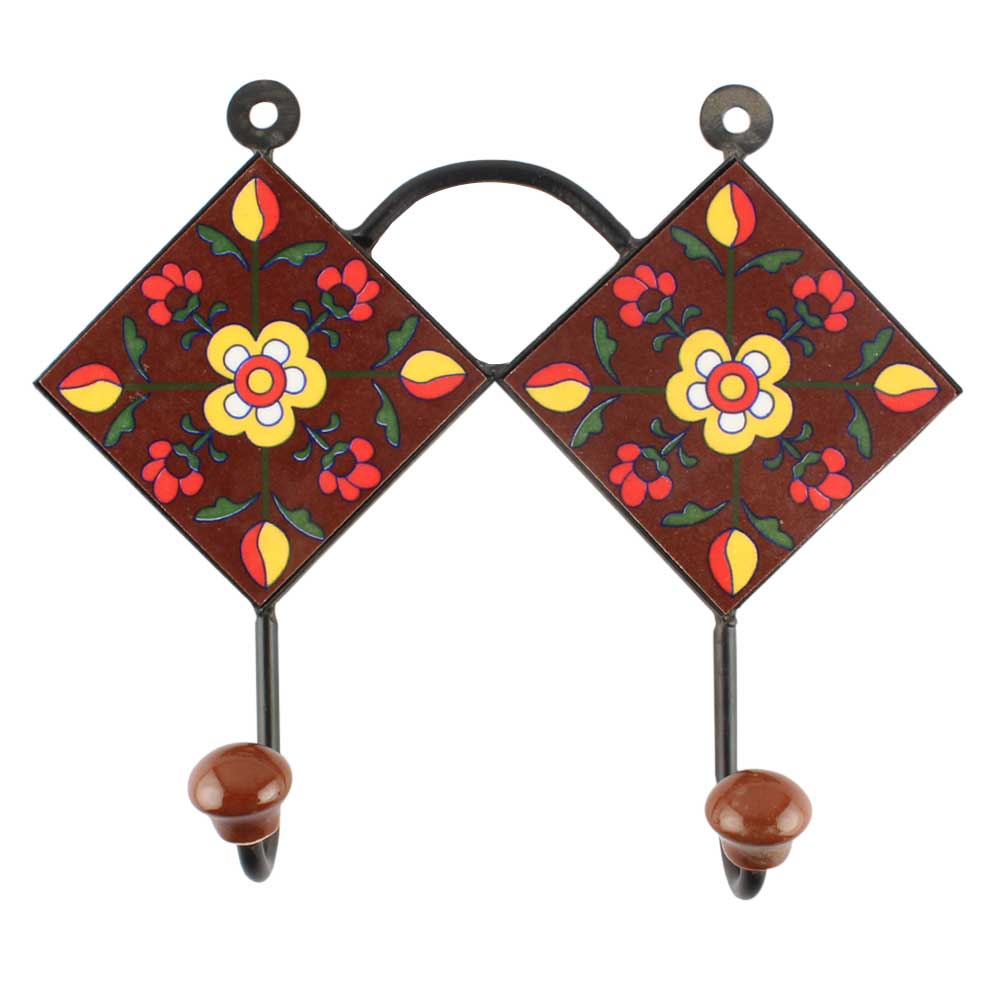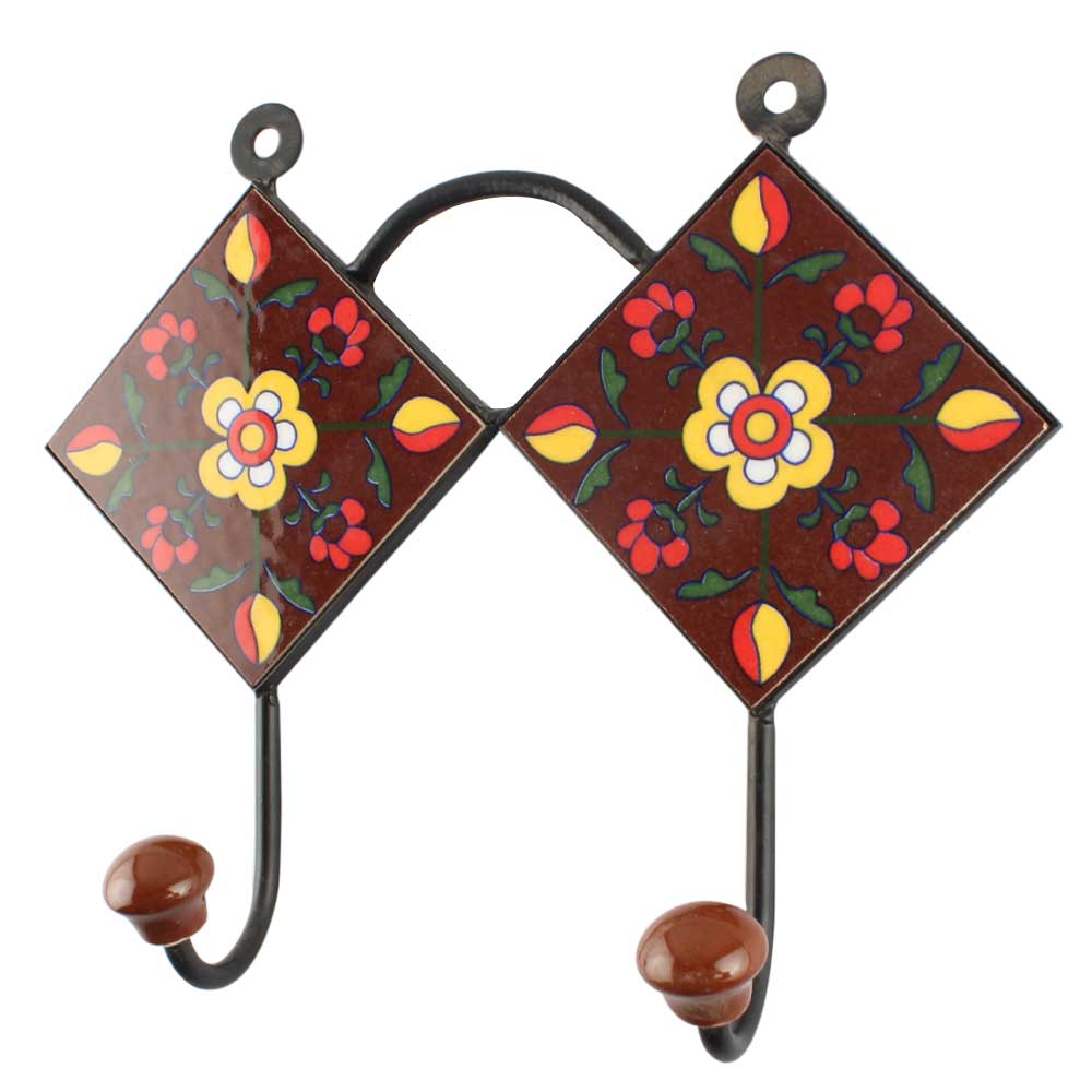 Dark Brown Flower Ceramic Tile Hook. When Put on Wall or Cabinet It is An Art in Itself. The Metal Part of this Hook is Black Powder Coated.
