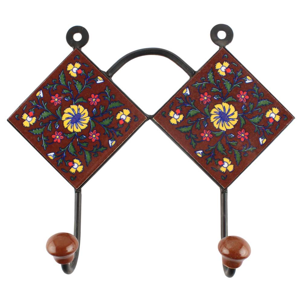 Dark Brown With Yellow Wheel Flower Ceramic Tile Hook. When Put on Wall or Cabinet It is An Art in Itself. The Metal Part of this Hook is Black Powder Coated.