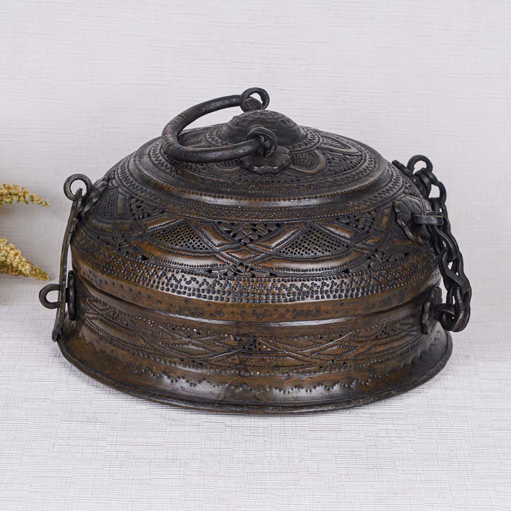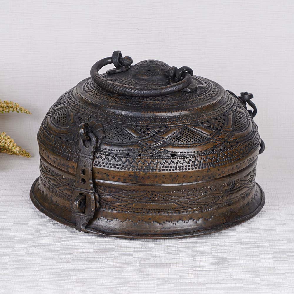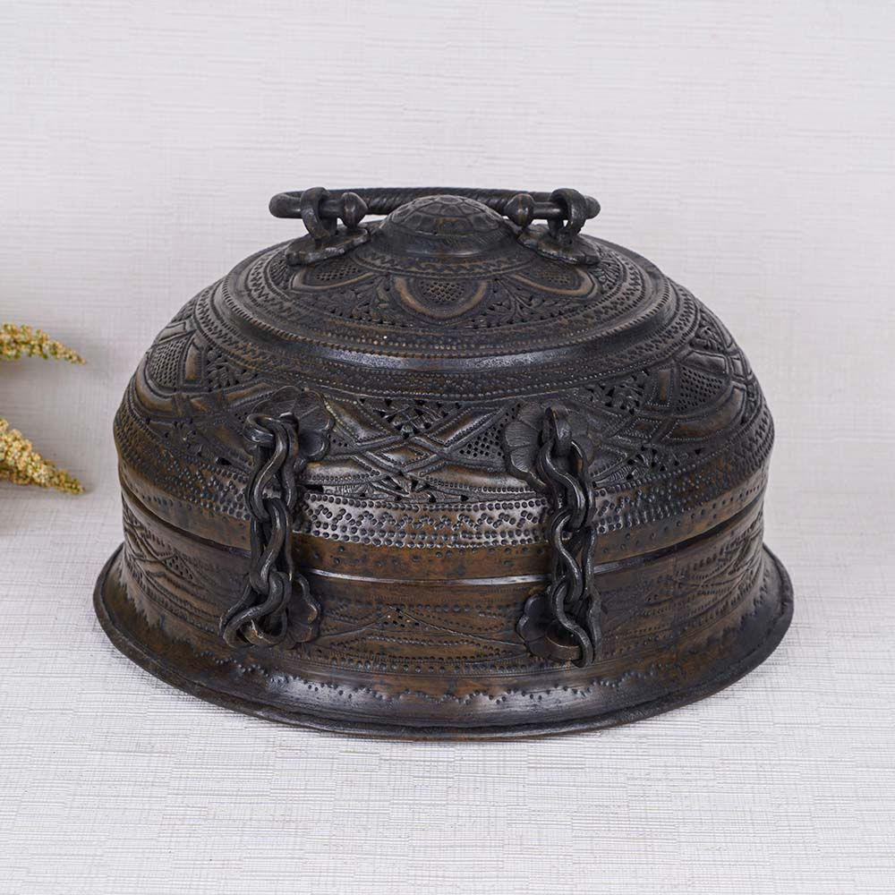 Introducing the finest masterpiece in jewelry storage, the best jewelry box crafted with utmost precision and dedication by highly skilled Indian craftsmen. Using traditional methods passed down through generations, this brass jewelry box exudes an unparalleled charm. Its black finish adds a touch of vintage elegance, evoking a sense of timeless beauty. Adorned with intricate engravings and mesmerizing patterns, this jewelry box is a testament to the artistry and craftsmanship of its creators. Its top handle allows for effortless portability, while the secure latch ensures your precious items remain safe and protected. Originally designed to store jewelry at home, this versatile piece now serves multiple purposes. Whether used for storing jewelry or safeguarding cherished mementos, this jewelry box becomes an exquisite addition to any space. Ideal for embellishing your home, office, restaurant, or hotel, it effortlessly becomes a captivating centerpiece. Its allure is equally captivating when displayed at exhibitions or museums, attracting the attention of discerning enthusiasts. Make your loved ones feel cherished by gifting them this remarkable jewelry box on special or festive occasions. Experience the timeless beauty and functionality of this travel jewelry box, a treasure that transcends generations.