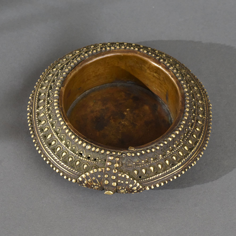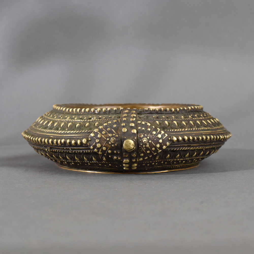 Immerse yourself in the rich heritage of tribal craftsmanship with this handcrafted brass tribal ashtray. Created using traditional Dhokra or lost-wax casting techniques, this piece features elaborate motifs of dots, lines, and teardrop shapes, meticulously arranged to evoke age-old symbolism and spiritual geometry. The symmetrical form, combined with the raised beadwork and patina finish, gives it a striking, antique aesthetic. This ashtray is not just a functional piece but a storytelling artifact – showcasing the ingenuity and creativity of rural artisans from India’s tribal heartlands. With its hollow, circular bowl and low rim design, it serves both as a smoking accessory and an ornamental conversation starter for your home, office, or ethnic décor setting.