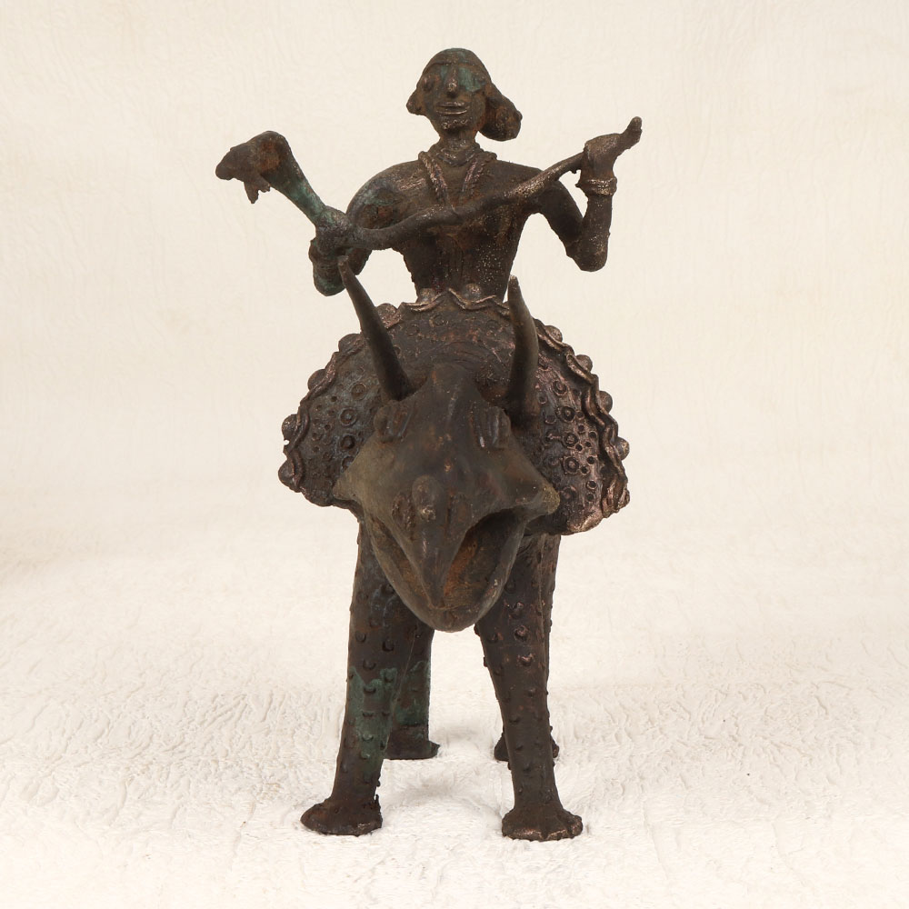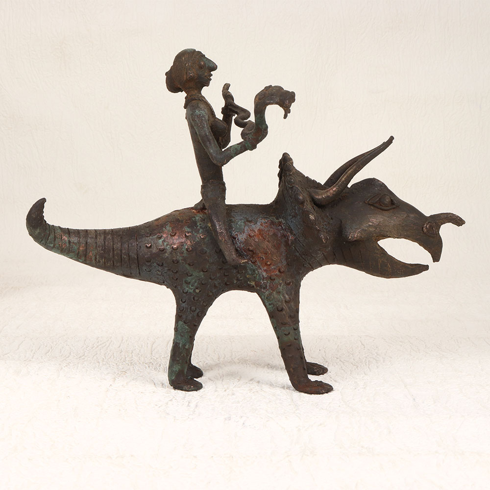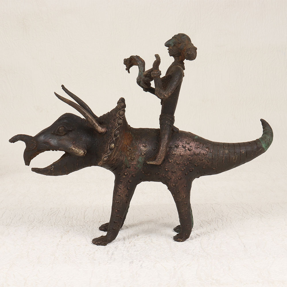 Decorate your living room with this exquisite Vintage Brass Triceratops with Rider that is an artisanal masterpiece crafted by talented Indian artisans from Bengal. Meticulously handmade with precision, this unique piece showcases a tribal art-inspired design, blending cultural aesthetics with prehistoric charm. The triceratops, rendered in high-quality brass, boasts a distinctive dark finish, adding a touch of timeless elegance to any space. This captivating creation is versatile, suitable for placement in homes, offices, restaurants, hotels, or cafes, becoming an instant conversation starter. Its intricate detailing and vintage allure make it a valuable addition to any collector's trove of curated artefacts. Celebrate special occasions by gifting this majestic triceratops to your loved ones, creating lasting memories on festive or auspicious days.