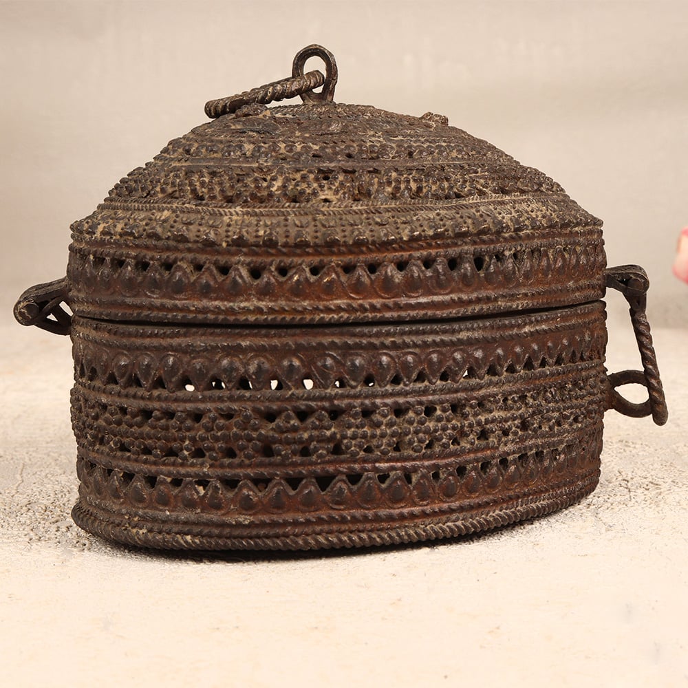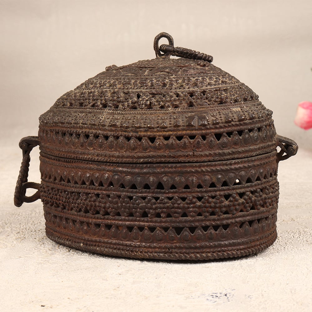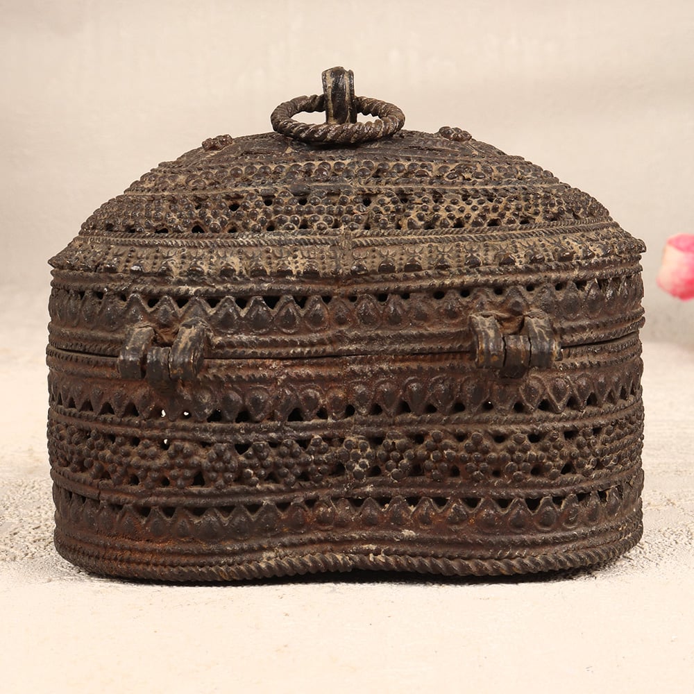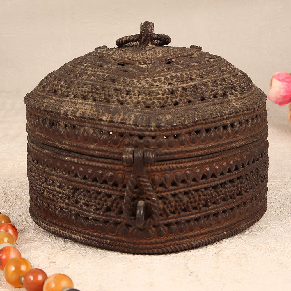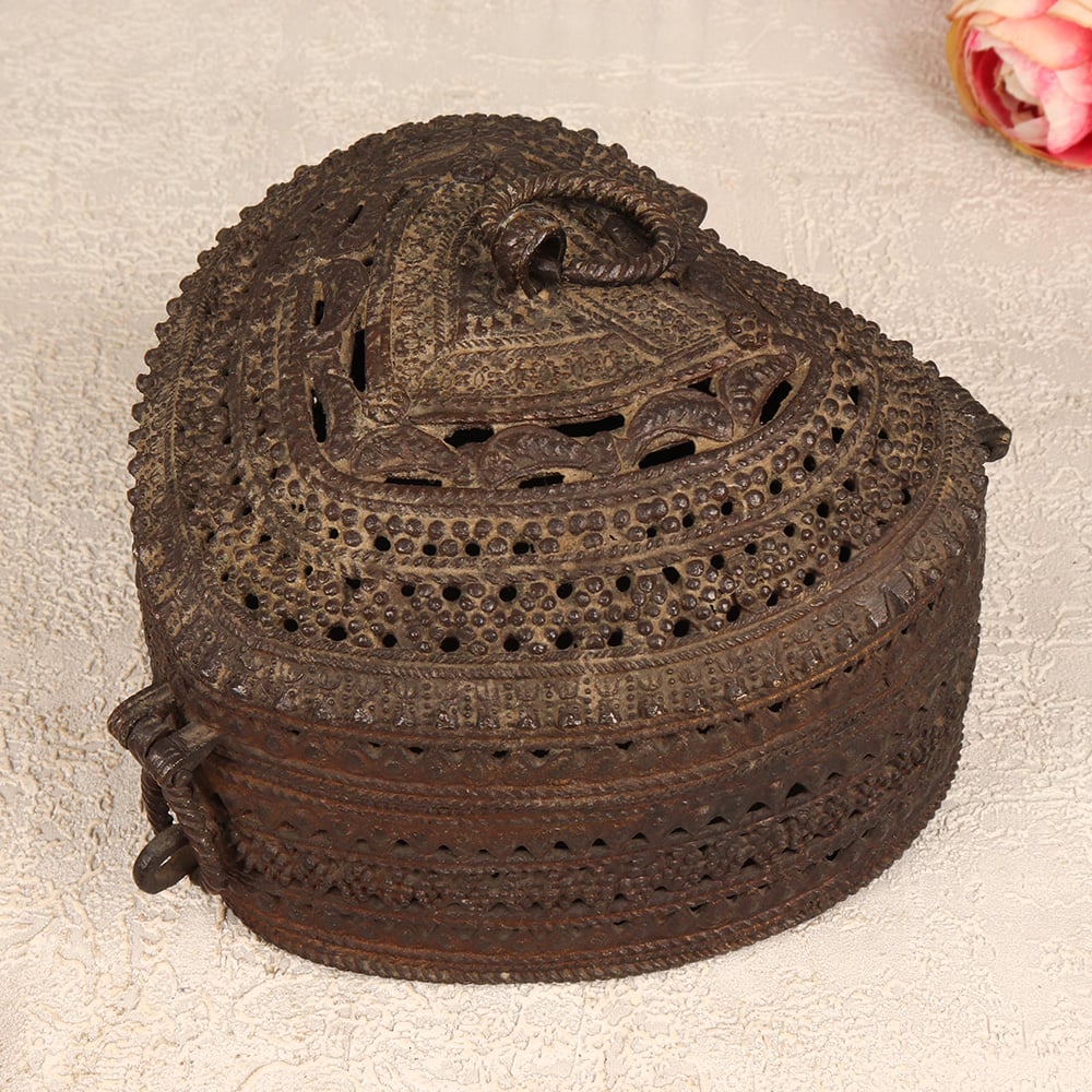 Enhance your jewelry collection with our exquisite Vintage Brass Heart-Shaped Jewelry Box. Crafted with precision and care by talented Indian artisans in the traditional Odisha Art style, this box is a testament to their craftsmanship. The heart shape, adorned with intricate jali work and beautiful engravings, adds a touch of timeless elegance. Made from high-quality brass, the jewelry box features a secure latch, ensuring your precious stones and jewelry are stored safely. The antique dark finish lends it an aura of nostalgia, making it a perfect addition to any vintage collection. This handmade masterpiece is versatile, finding its place in homes, offices, restaurants, hotels, or cafes, where it serves as both a functional storage solution and a captivating decor piece. Impress your loved ones by gifting them this vintage brass jewelry box on special, festive, or auspicious occasions.