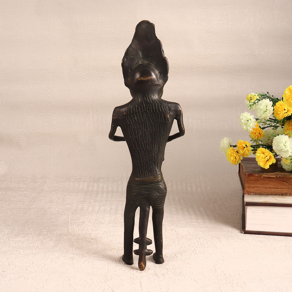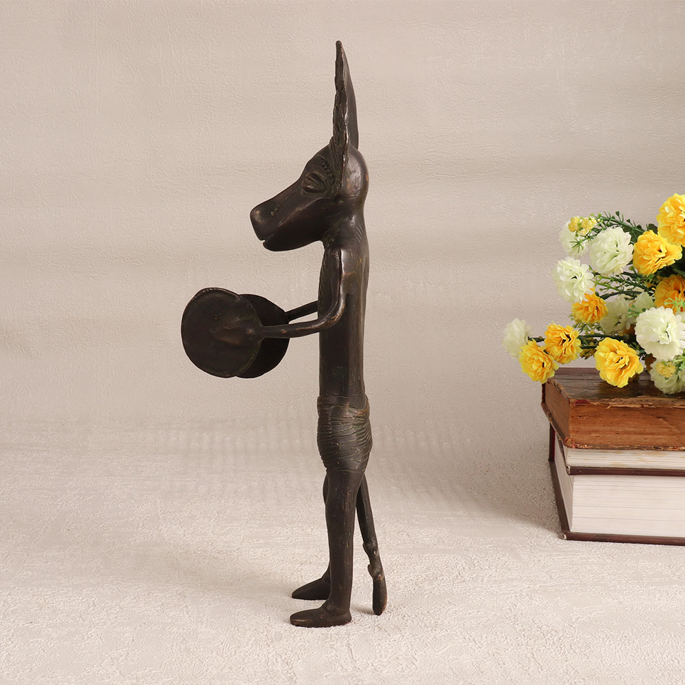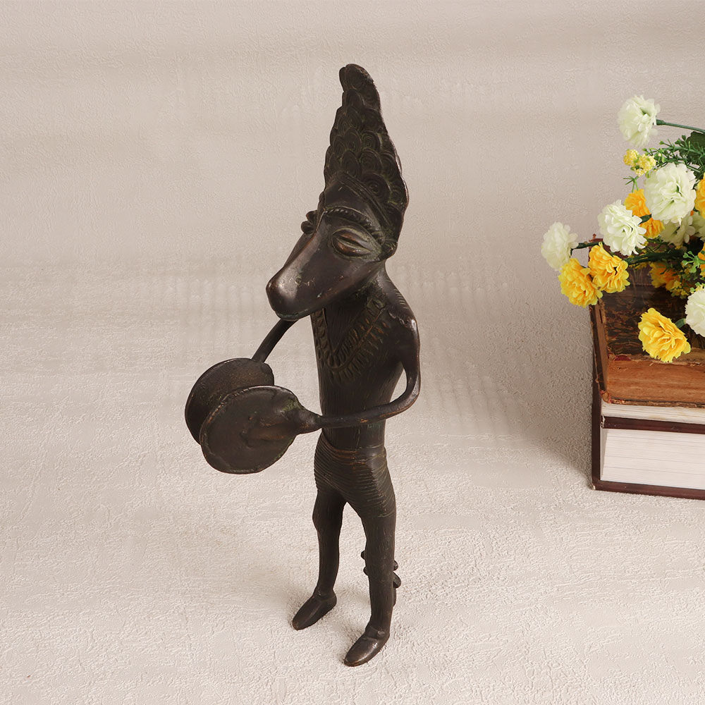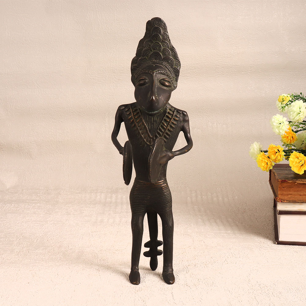 Enhance your home interior with a captivating piece of artistry which is a stunning brass statue of a male figure standing proudly and playing the cymbal. This masterpiece is exquisitely crafted by professional Indian artisans in the tradition of Folk Himalayan Art and embodies the rich cultural heritage and craftsmanship of the region. The statue boasts an antique dark finish that imparts a sense of history and character, making it a timeless addition to any space. Meticulously handcrafted from high-quality brass, this piece radiates authenticity and quality. Its versatility knows no bounds, as it can adorn your home, office, hotel, cafe, shop, or restaurant with its artistic presence. This versatile statue is perfect for adding a touch of elegance to any setting. Beyond its decorative appeal, this brass figure is a valuable addition to vintage collections and an eye-catching exhibit for special exhibitions. It's an ideal gift choice for your loved ones on special, festive, or auspicious occasions, symbolizing the beauty of tradition and artistic expression.