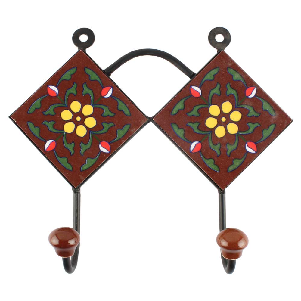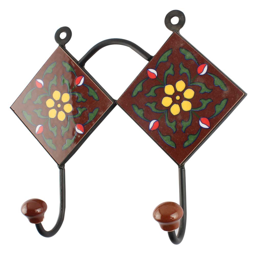 Dark Floral Ceramic Tile Hook. When Put on Wall or Cabinet It is An Art in Itself. The Metal Part of this Hook is Black Powder Coated.