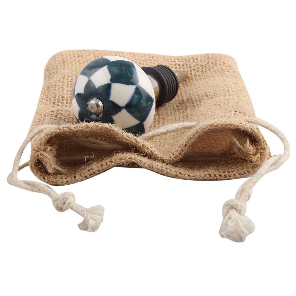 Dark Green Check Ceramic Wine Stopper.zinc alloy wine bottle stopper with attractive Jute Bag Packaging.