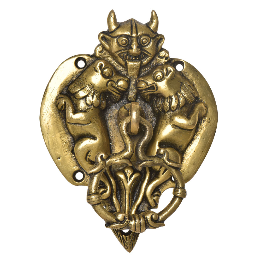 A truly perfect optioA very heavy and decorative brass knocker with the demons face on top and two Lions on both sides with the knocker attached to the centre of the broad strike plate. An elegant vintage decor item.