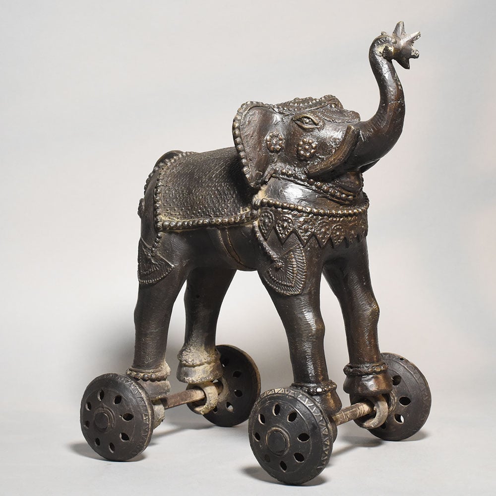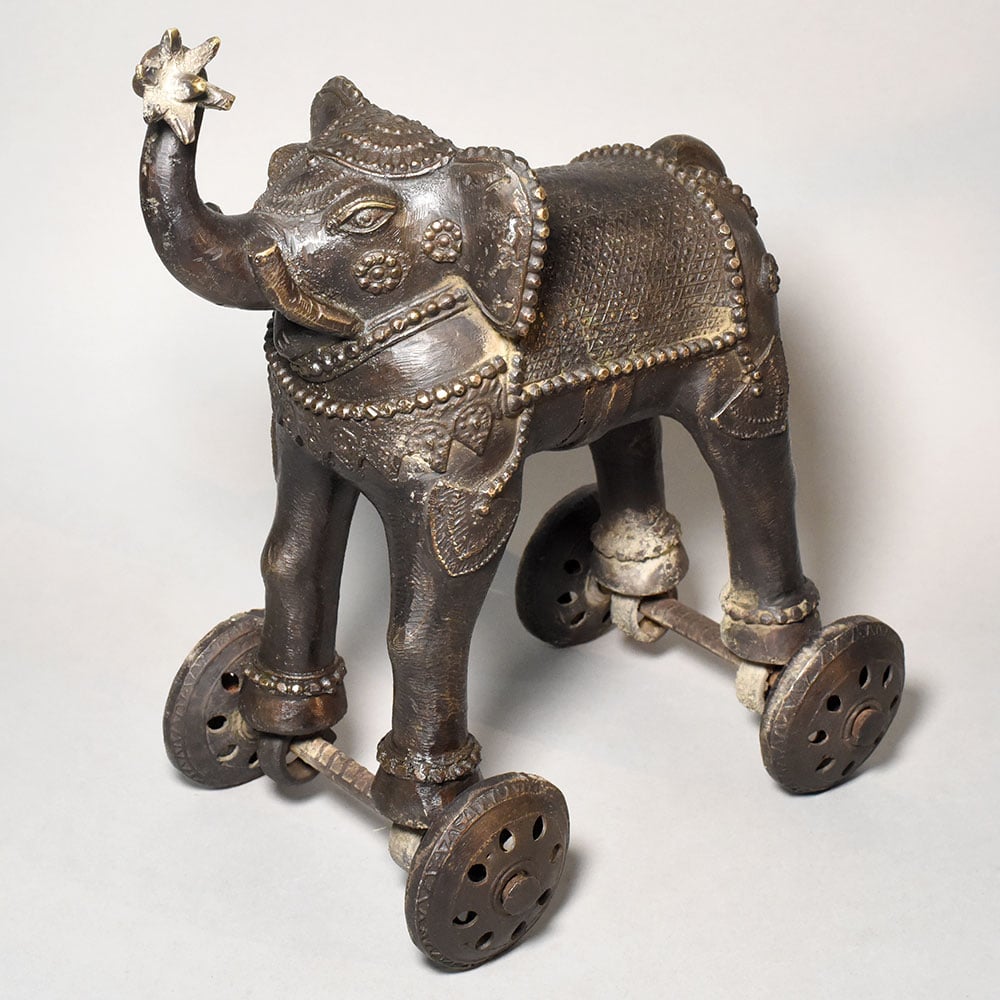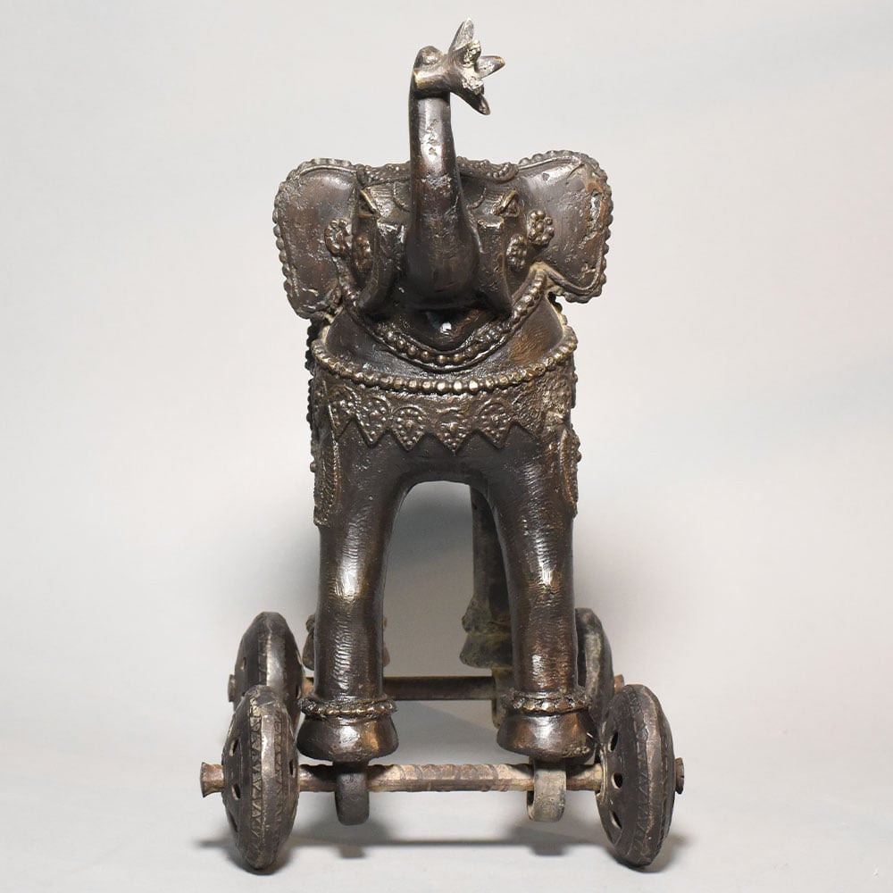 This decorative brass elephant on wheels is a distinctive example of traditional Indian folk metal craft. Designed as a rolling toy, the sculpture features a finely detailed elephant standing on four small metal wheels connected by simple axles. The movable base allows the figurine to glide smoothly when pushed, giving it both decorative and playful character. The elephant is richly ornamented with engraved saddle patterns, dotted borders, and decorative collars that resemble ceremonial elephant adornments seen in royal processions and temple festivals. The raised trunk holds a small star-shaped ornament, adding a unique artistic feature that sets this piece apart from standard animal figurines. Every surface of the sculpture shows careful hand-worked detailing. Textured patterns across the body, along with engraved lines and small ornamental motifs, highlight the craftsmanship of traditional metal artisans. Over time, the brass has developed a natural aged patina that deepens the visual character of the piece and emphasizes its vintage appeal. Mounted on four round perforated wheels, the figurine reflects the style of classic handcrafted mechanical toys once made in rural artisan communities. Today, pieces like this are admired as collectible folk artifacts. Perfect for antique toy collectors, brass artifact enthusiasts, or heritage dcor displays, this rolling elephant figurine adds cultural charm and historical character to any interior setting.