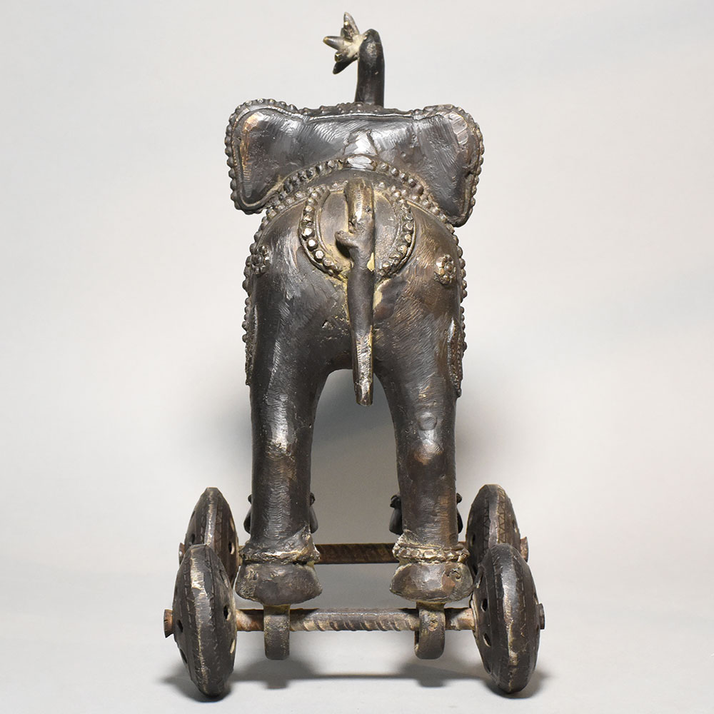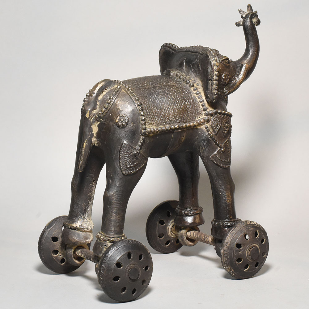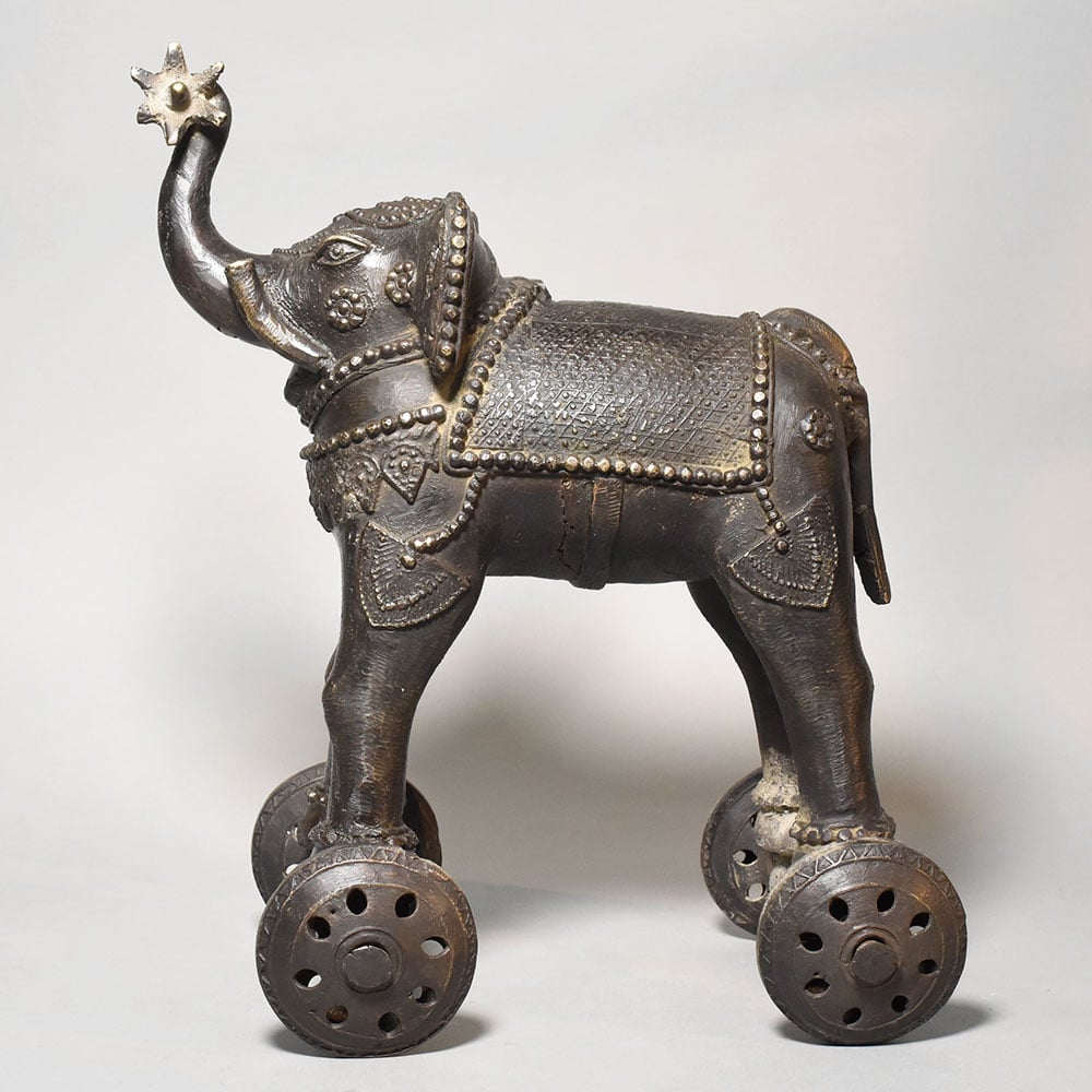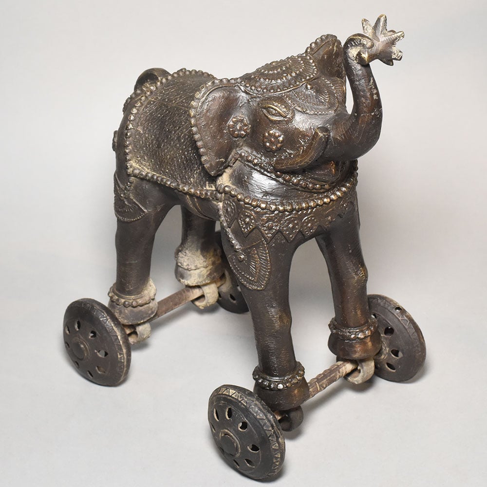 This decorative brass elephant on wheels is a distinctive example of traditional Indian folk metal craft. Designed as a rolling toy, the sculpture features a finely detailed elephant standing on four small metal wheels connected by simple axles. The movable base allows the figurine to glide smoothly when pushed, giving it both decorative and playful character. The elephant is richly ornamented with engraved saddle patterns, dotted borders, and decorative collars that resemble ceremonial elephant adornments seen in royal processions and temple festivals. The raised trunk holds a small star-shaped ornament, adding a unique artistic feature that sets this piece apart from standard animal figurines. Every surface of the sculpture shows careful hand-worked detailing. Textured patterns across the body, along with engraved lines and small ornamental motifs, highlight the craftsmanship of traditional metal artisans. Over time, the brass has developed a natural aged patina that deepens the visual character of the piece and emphasizes its vintage appeal. Mounted on four round perforated wheels, the figurine reflects the style of classic handcrafted mechanical toys once made in rural artisan communities. Today, pieces like this are admired as collectible folk artifacts. Perfect for antique toy collectors, brass artifact enthusiasts, or heritage dcor displays, this rolling elephant figurine adds cultural charm and historical character to any interior setting.