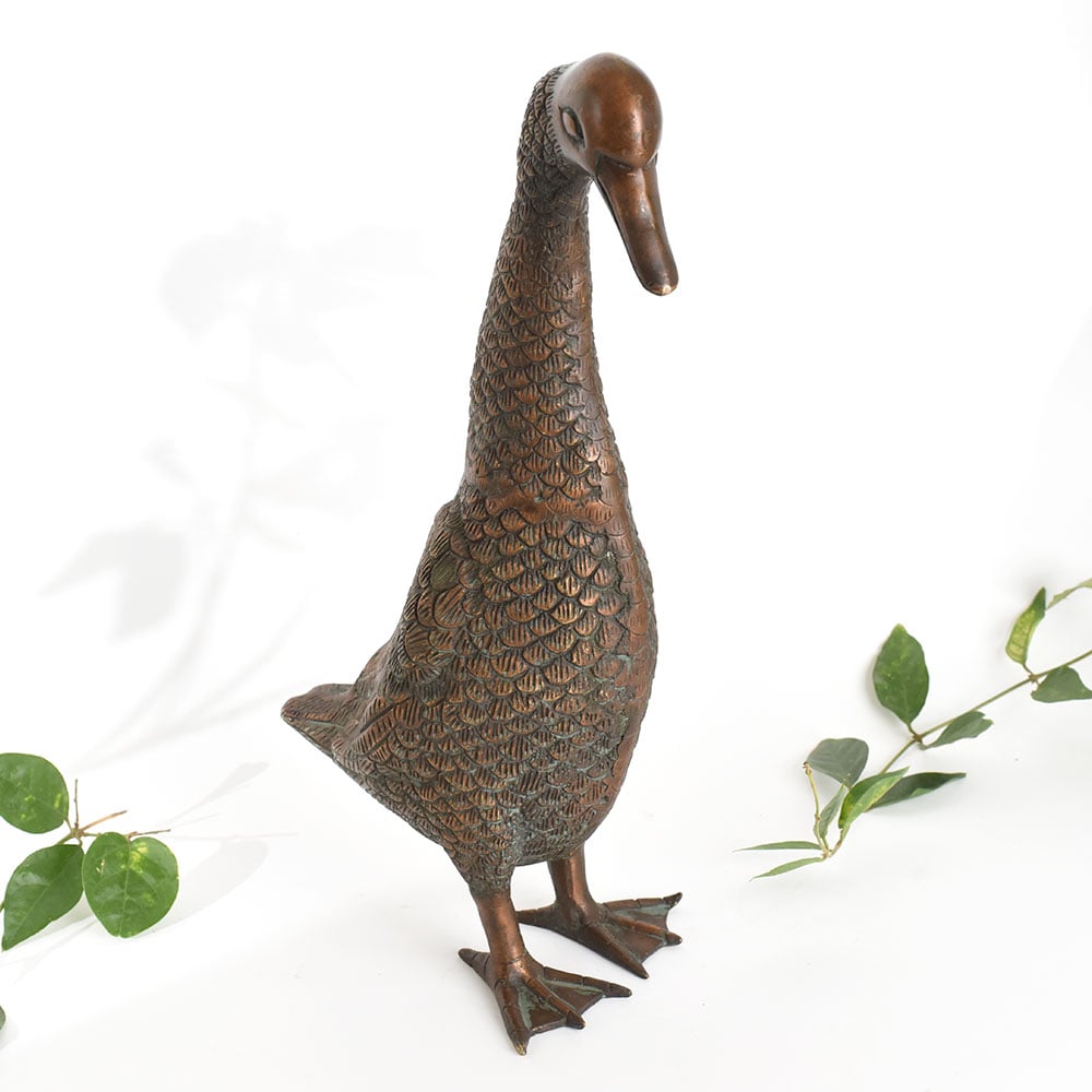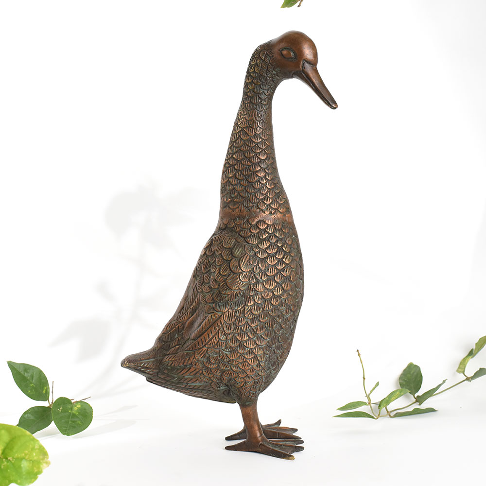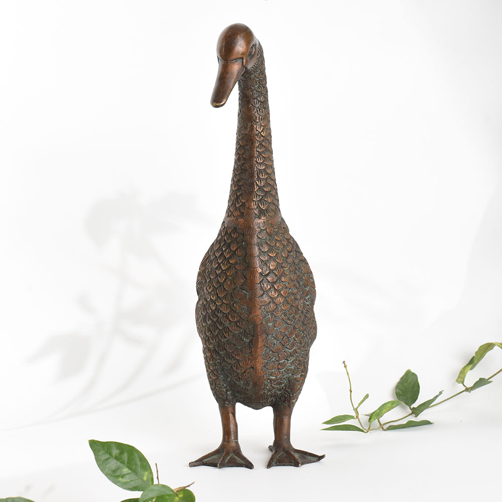 Add whimsy and charm to your decor with this decorative bronze goose statue. Standing tall with elegantly detailed feathers and a graceful neck, this piece captures the quiet beauty of waterfowl. Place it in an entryway, garden room, or living area to bring a touch of nature indoors. The hand applied patina gives the statue depth and warmth, while the solid bronze construction ensures it will last for generations. Use it as a standalone ornament or as part of a larger vignette with other wildlife figurines. Each piece is crafted individually, resulting in slight differences in finish that enhance its one of a kind appeal.