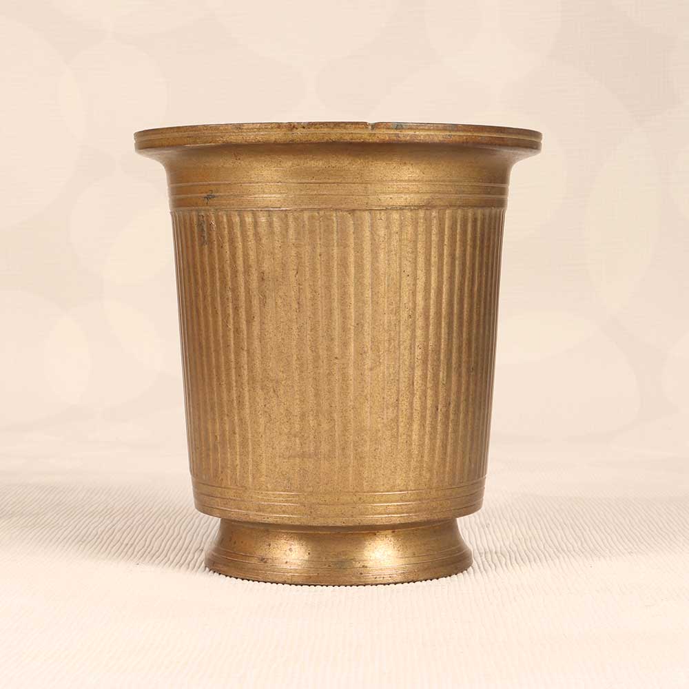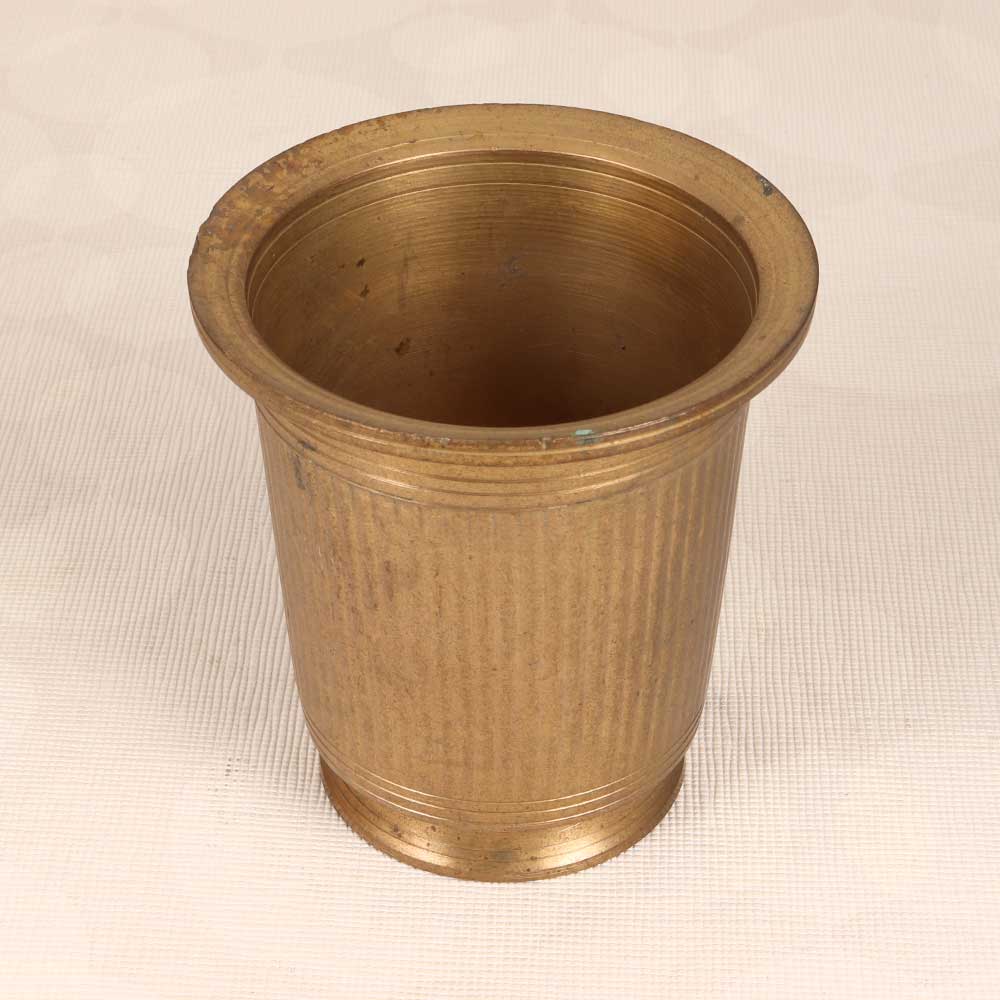 Transport your spirituality to another realm with this vintage brass holy water cup. Featuring intricate South Indian art motifs and a plain brown finish, this cup makes a striking addition to any home shrine or altar. The solid brass construction ensures durability and lasting beauty, while the unique shape allows for convenient dipping and sipping during rituals and prayers. Fill with holy water or flowers to uplift your sacred space. Let this cup's elegant yet understated design elevate your worship to new heights.
