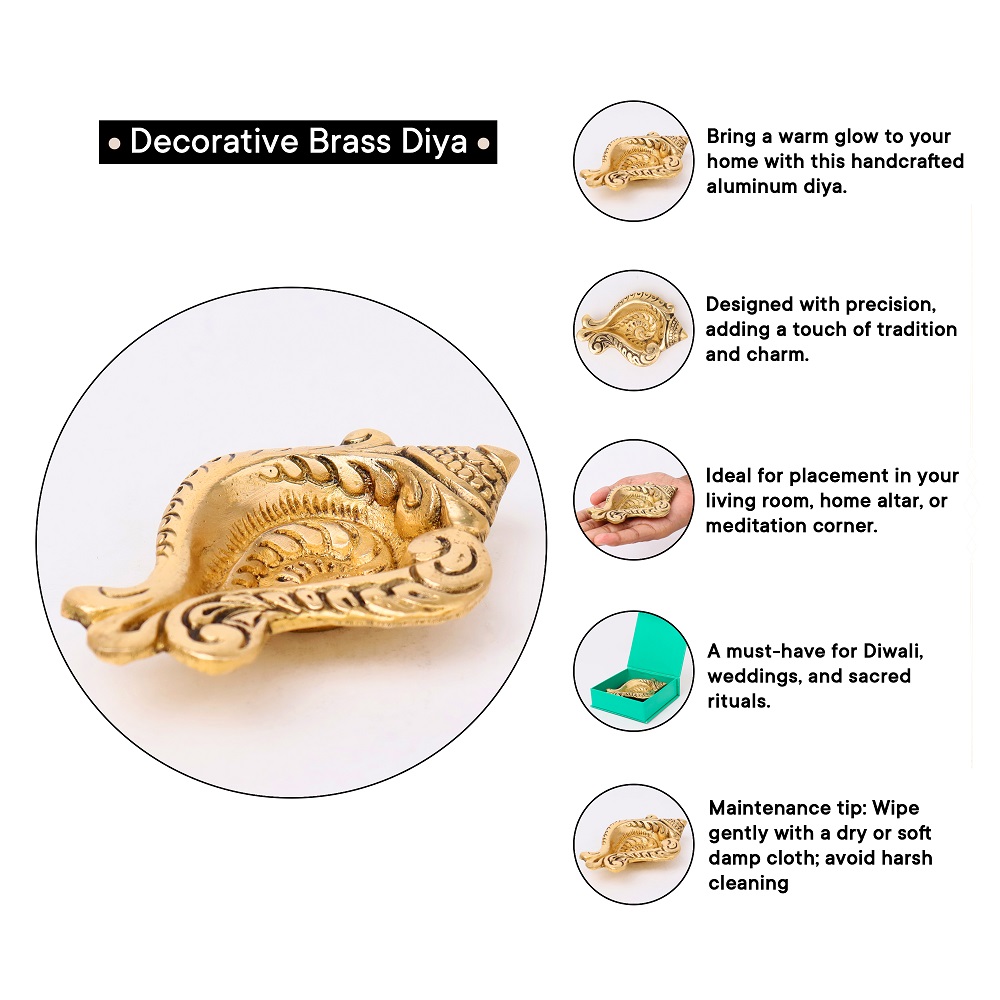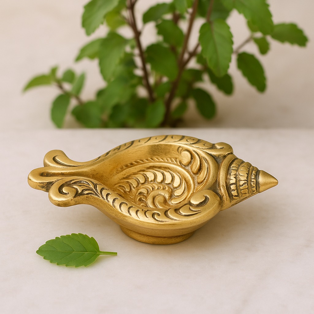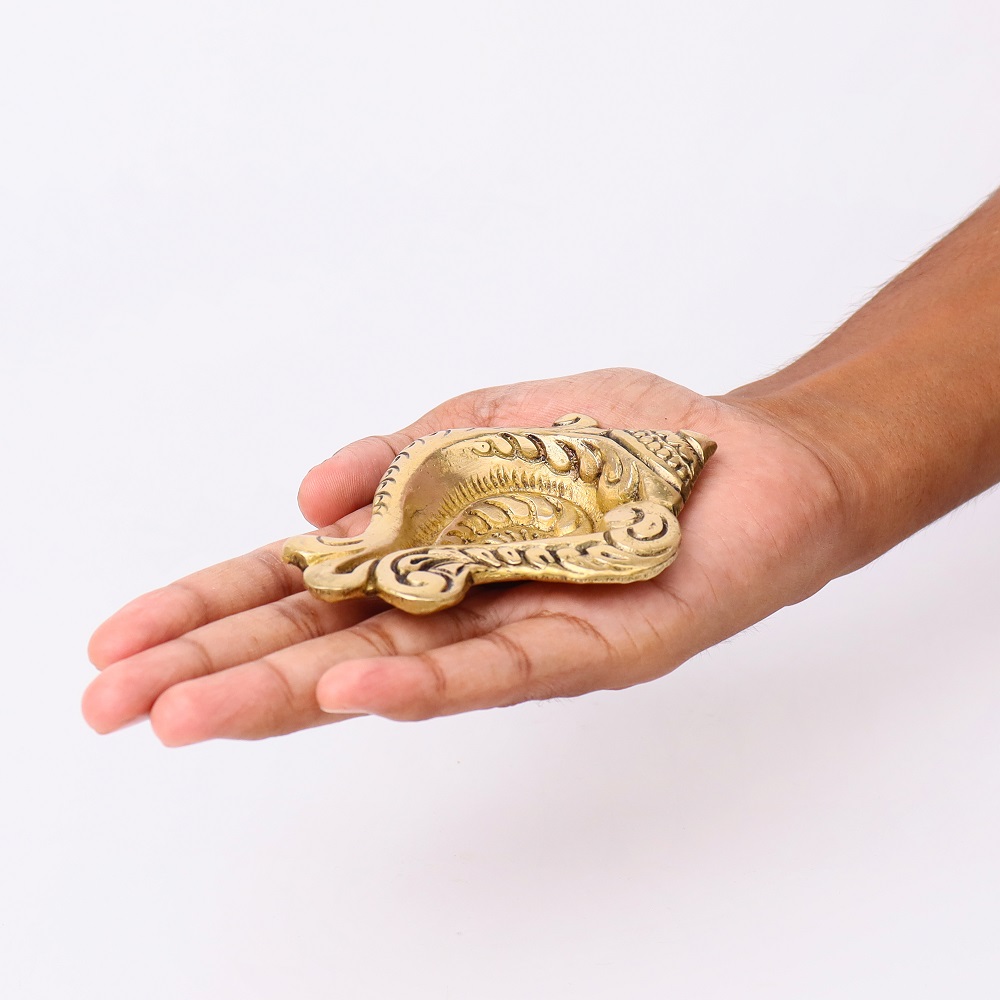 Invite auspicious energy into your home with this Brass Conch Shaped Oil Lamp, a diya inspired by the sacred shankh—a revered symbol of purity, protection, and divine blessings in Hindu tradition. Designed with a golden polished finish and a single wick holder, it combines spiritual depth with artistic elegance. Perfect for Diwali, temple rituals, and devotional spaces, this diya embodies light, sound, and sacred energy.